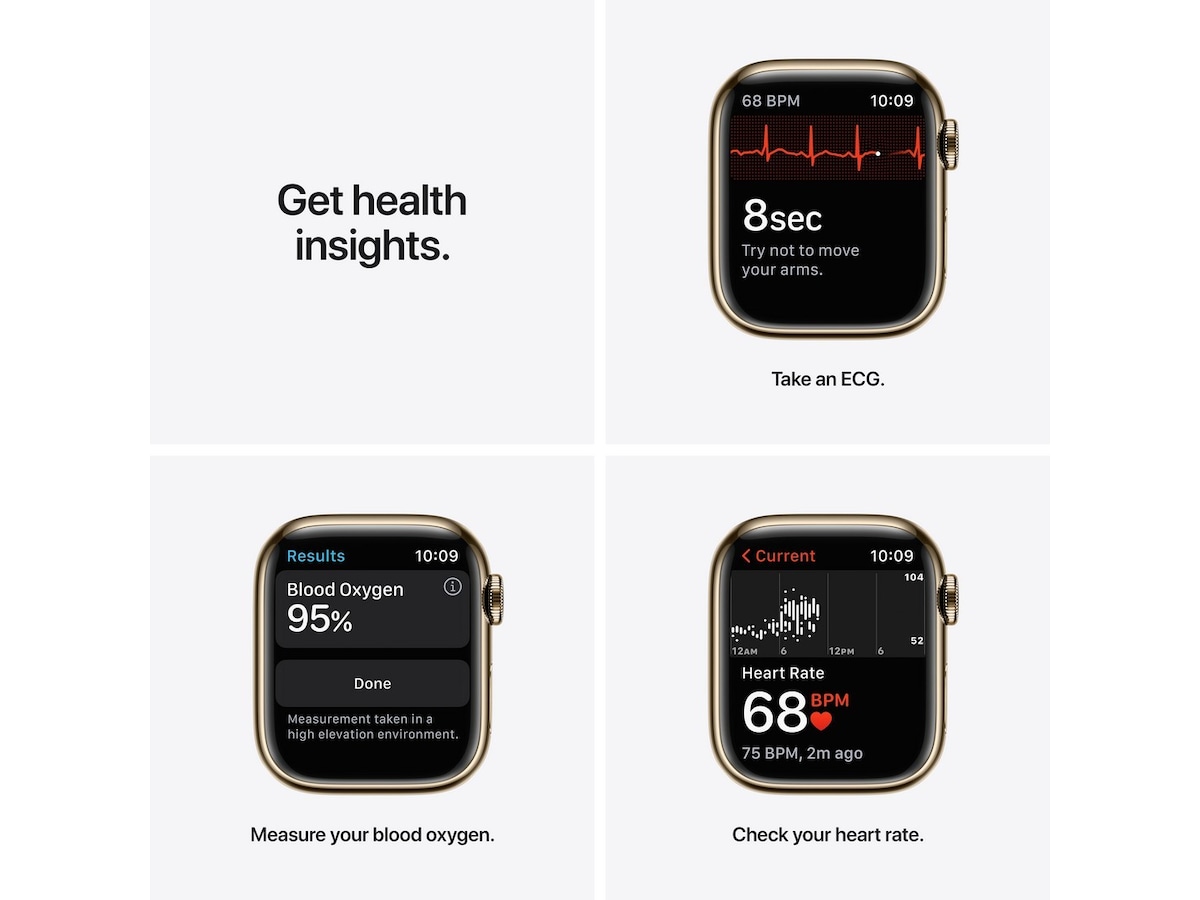 En avanceret sensor og app, der måler iltmætningen i blodet.¹ Mulighed for at tage et EKG til enhver tid.² Advarsler ved usædvanligt høj eller lav puls og ujævn puls.³ Og apps til opmærksomt nærvær og søvnsporing. Apple Watch Series 7 giver dig adgang til avancerede sundhedsfunktioner lige fra dit håndled.