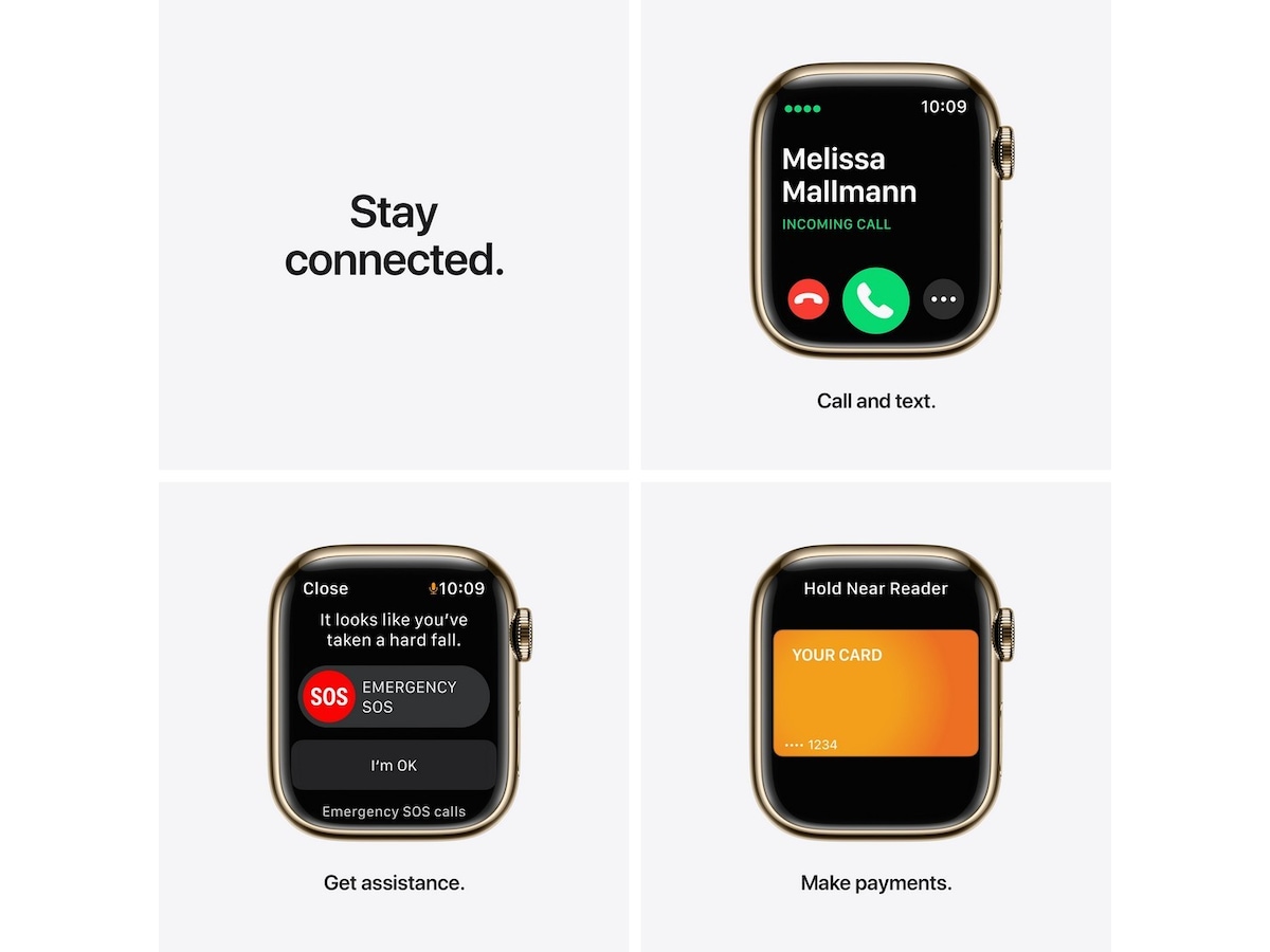 Med mobilnetværk holder Apple Watch Series 7 dig opdateret om, hvad der sker, og gør det let at holde kontakten med dem, du elsker - også når din telefon ligger derhjemme. Ring og besvar beskeder. Stream musik, podcasts og lydbøger. Og få hurtigt hjælp med nødopkald (SOS) og internationale alarmnumre.