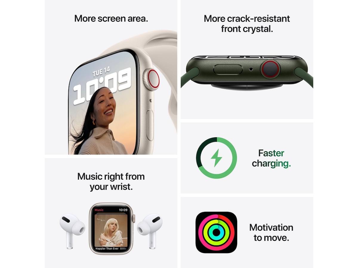 Vores største, mest avancerede Retina-skærm til dato, som altid er tændt, gør alt på Apple Watch Series 7 endnu større og bedre. Serie 7 er vores mest solide Apple Watch nogensinde, nu med endnu mere stødsikkert glas på forsiden. Avancerede funktioner gør det muligt at måle iltmætningen i blodet,¹ tage et EKG til enhver tid² og bruge apps til opmærksomt nærvær og søvnsporing. Det registrerer og måler også snesevis af motionsformer, herunder de nye træningspas taichi og pilates.