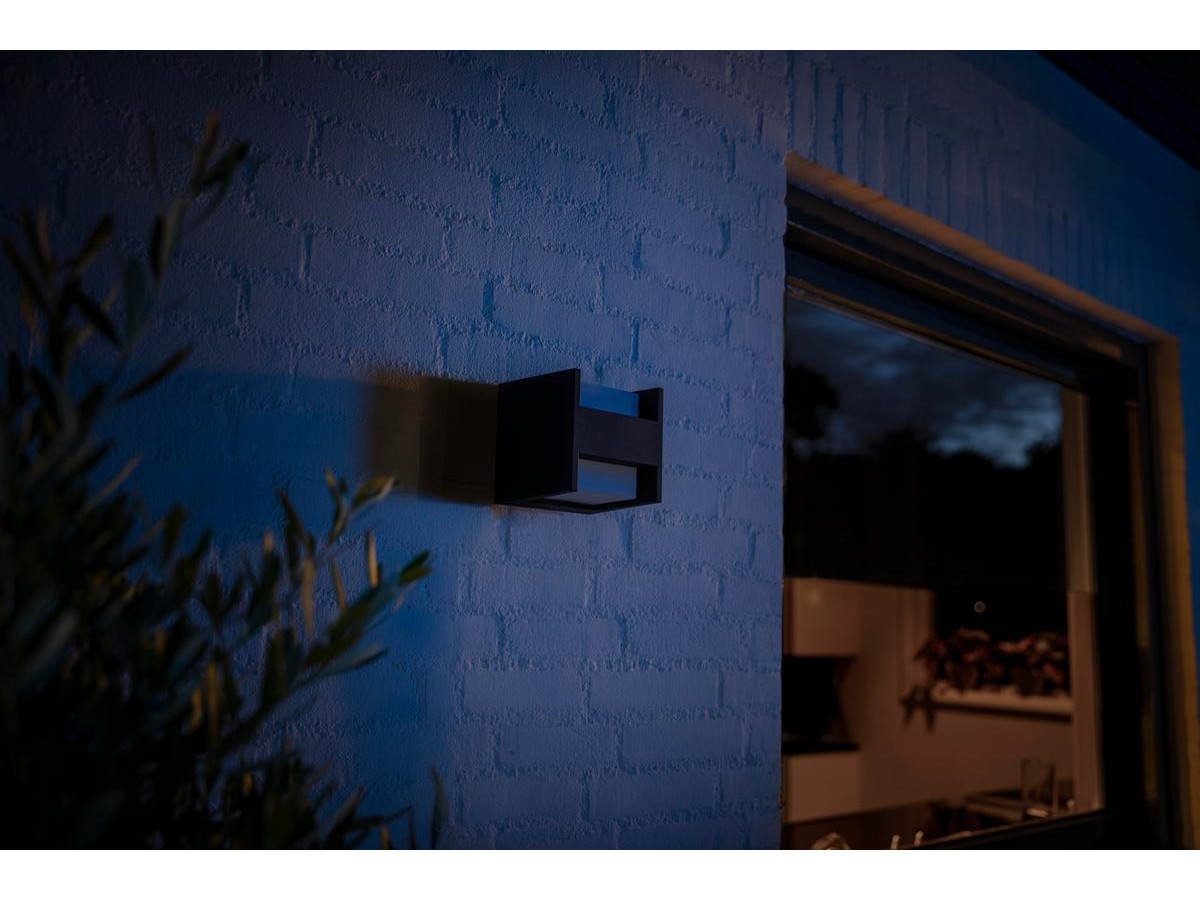 Philips Hue Fuzo er en familie af moderne firkantede udendørslamper. Som en del af White serien kan denne væglampe dæmpes i lysstyrke og lyse med forskellige hvide nuancer.