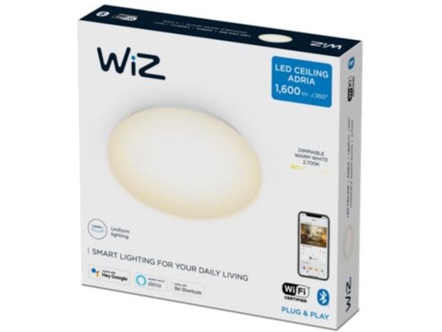 WiZ Adria er den intelligente loftslampe, der oplyser et hvilket som helst rum med blødt hvidt lys og tilføjer et moderne touch og hyggelig belysning til dit hjem. Det simple runde design gør Adria til en naturlig del af din boligindretning og sørger for, at du får en god, jævn og komfortabel belysning hvor som helst.