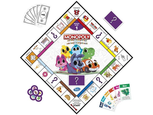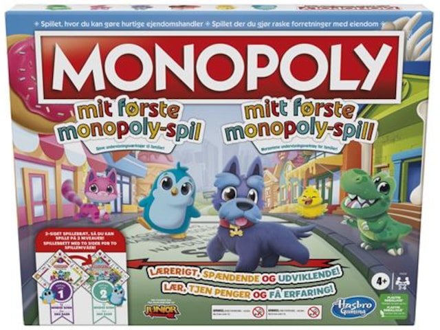My First Monopoly Game er et sjovt læringsværktøj. Spillet har et dobbeltsidet spillebræt med 2 spilleniveauer, så I selv kan vælge et niveau.