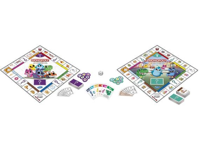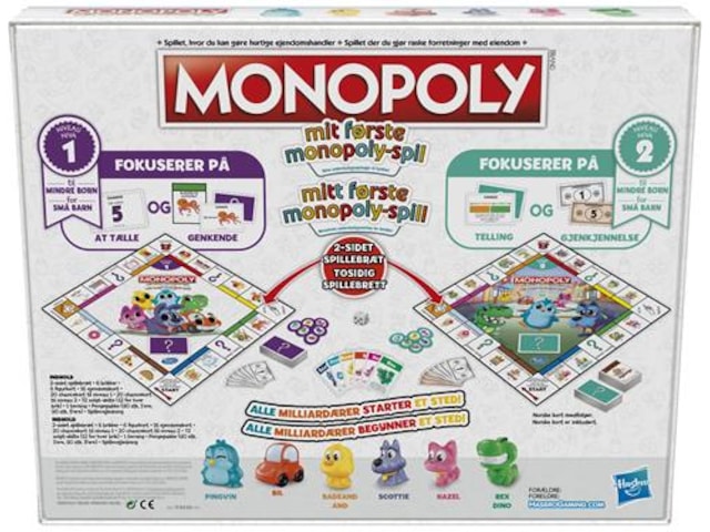 Den ene side fokuserer på at tælle og matche og anbefales til børn i alderen 4 til 5 år. Vend brættet om for et mere avanceret spil, der fokuserer på læsning og enkel matematik – anbefales til børn fra 6 år. Hvert spilleniveau har sine egne Monopoly-penge og -kort samt regler. Spillet er inspireret af det klassiske Monopoly-spil – alle milliardærer skal jo starte et sted!