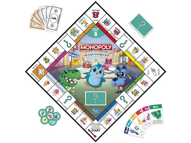 My First Monopoly Game er et sjovt læringsværktøj for familier. Spillet har et dobbeltsidet spillebræt med 2 spilleniveauer, så I kan vælge det niveau, der passer bedst til familien.