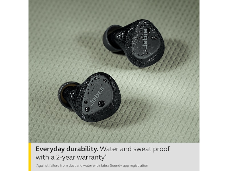 De er skabt til at blive siddende, uanset hvor hårdt du træner. Udviklet til et aktivt liv – perfekte til alle former for motion. De er desuden IP 57-klassificerede, så de er både vand- og svedtætte. Og med to års garanti**, når du registrerer dem i vores Jabra Sound+ app, har du et par følgesvende, du altid kan stole på. Aktiv støjdæmpning (ANC) blokerer uønskede lyde med et enkelt tryk på en knap, så du kan fordybe dig i din musik og træning. Kom væk fra byens støj og ind i zonen – og bliv der.