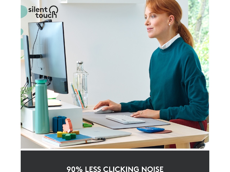 Nyd 90 % mindre klikstøj og mere fokus takket være SilentTouch, en eksklusiv Logitech-teknologi, der reducerer forstyrrende klik- og skrivelyde og skaber et bedre, mere stille miljø for dig og dem omkring dig.
