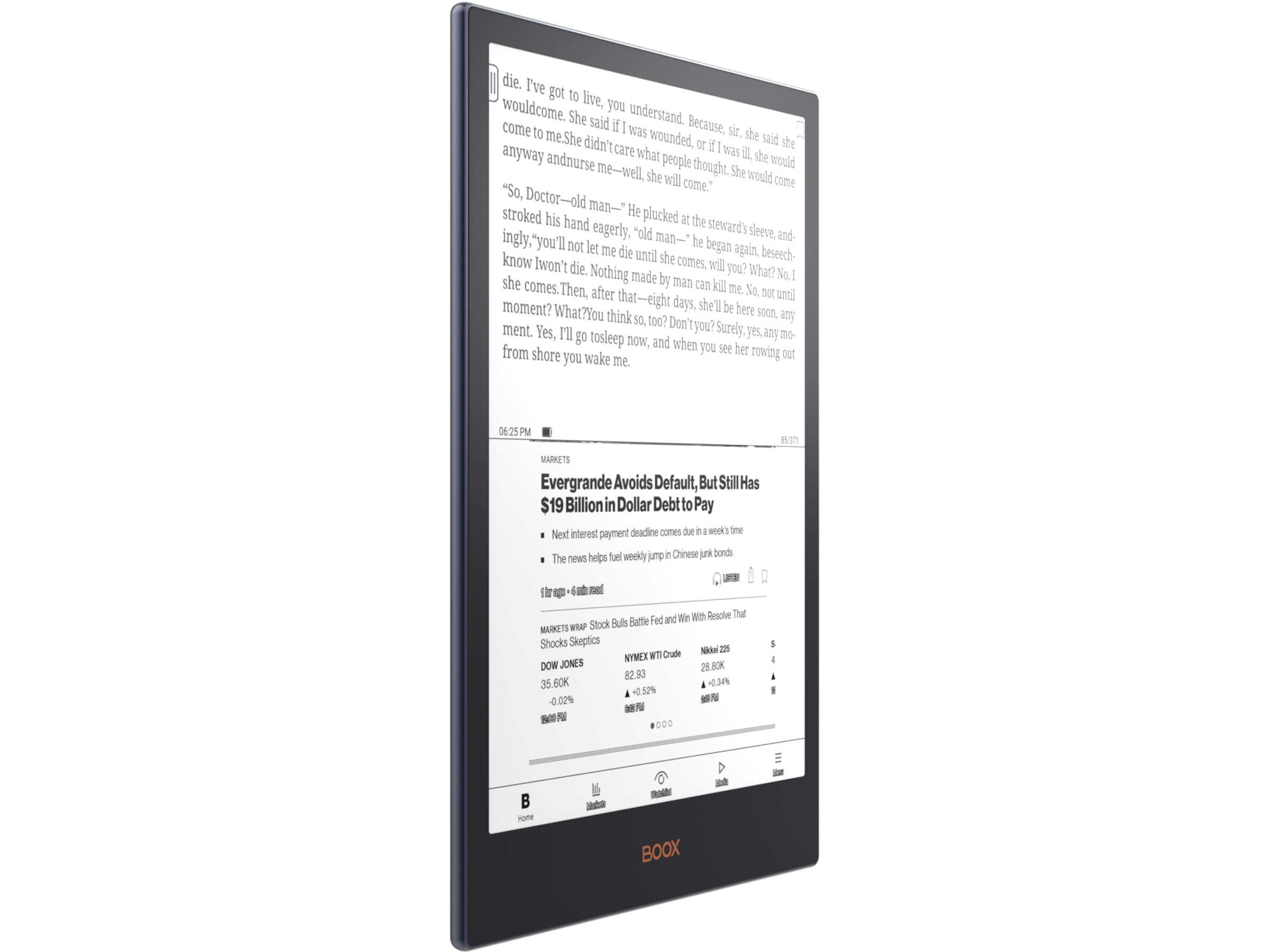 E Ink Mobius Carta 10.3”-skærmen har en lysere baggrund og højere kontrast end nogen skærm i denne klasse. Det giver dig mulighed for at læse i skarpt sollys, og den har en høj skærmopdateringshastighed. Fraværet af flimrende frontlys og princippet om billeddannelse ved hjælp af »elektronisk blæk« gør læsning øjenvenlig. Multitouch-skærmen giver nem kontrol under læsning: sidevending med korte tryk, sideflytning, zoom med to fingre, noter i teksten og brug af yderligere muligheder.