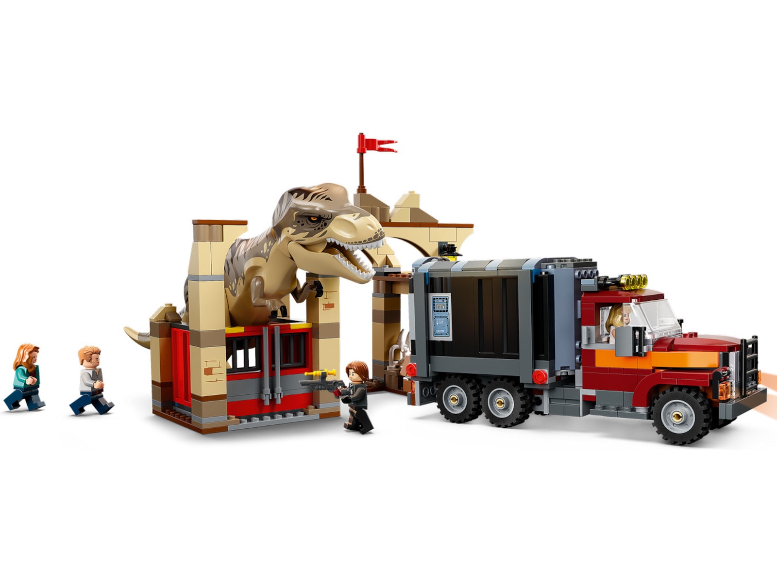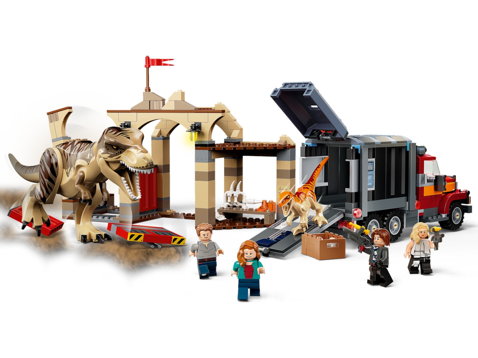 - Sjove funktioner og detaljer – Markedspladsen har en T. rex-indhegning med en flugtfunktion, og lastbilen har plads til 2 atrociraptorer. Find en anden atrociraptor i sættet 76945