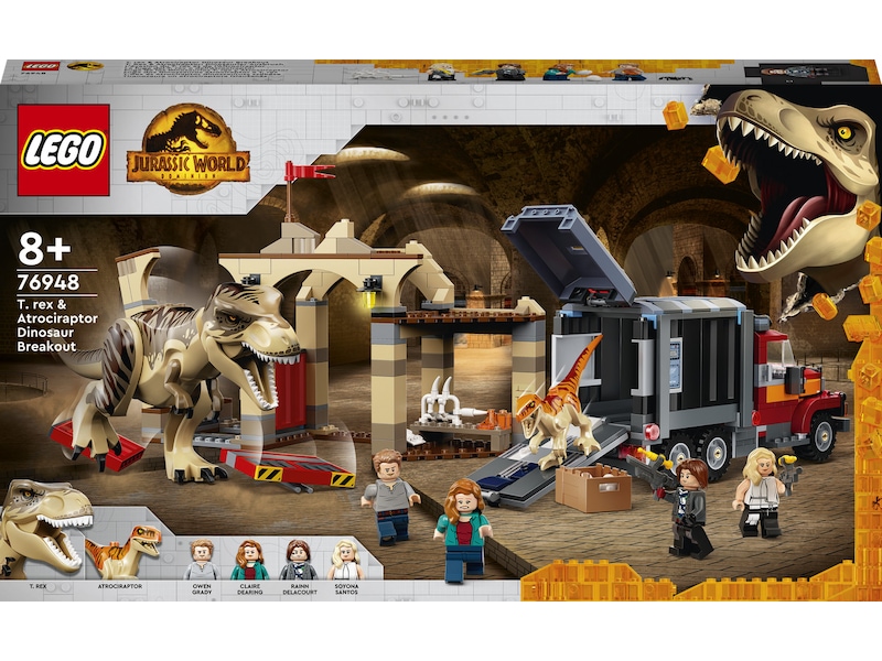 - T. rex-legesæt – Fans af filmen Jurassic World Dominion kan udspille historier med en T. rex og atrociraptor på dinosaurflugt (76948) i dette sæt med 2 bevægelige dinosaurfigurer, en stor lastbil, der kan bygges, og et marked