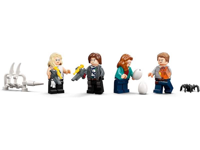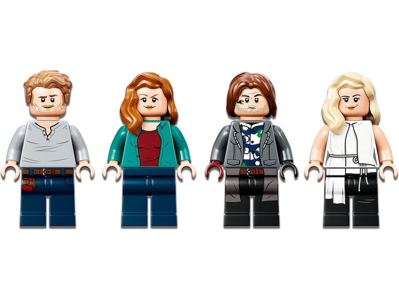 - 4 minifigurer og 2 dinosaurer – Owen Grady, Rainn Delacourt og Soyona Santos, hver med bedøvelsesvåben, og Claire Dearing, samt en T. rex, der er over 11 cm høj, og en atrociraptor