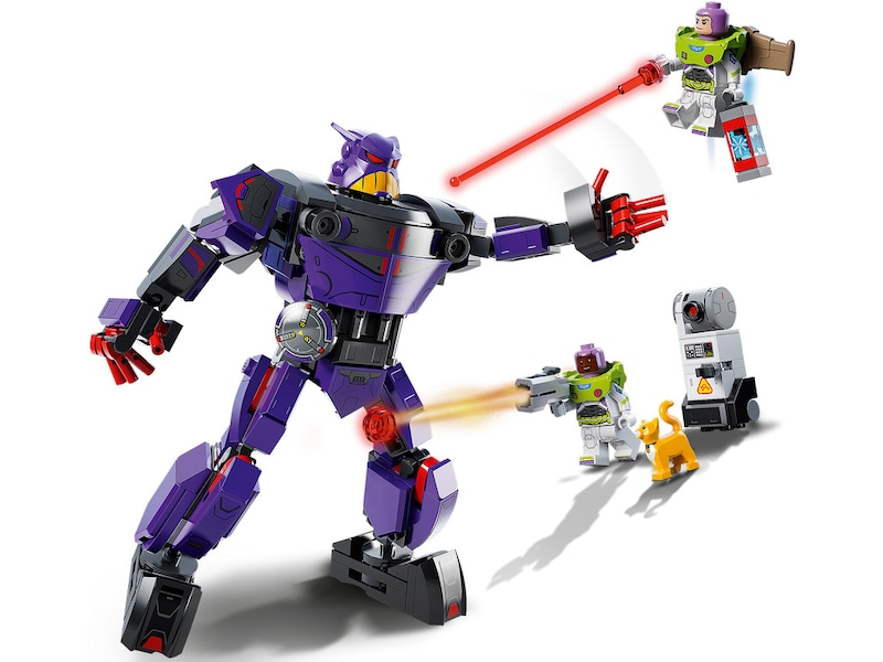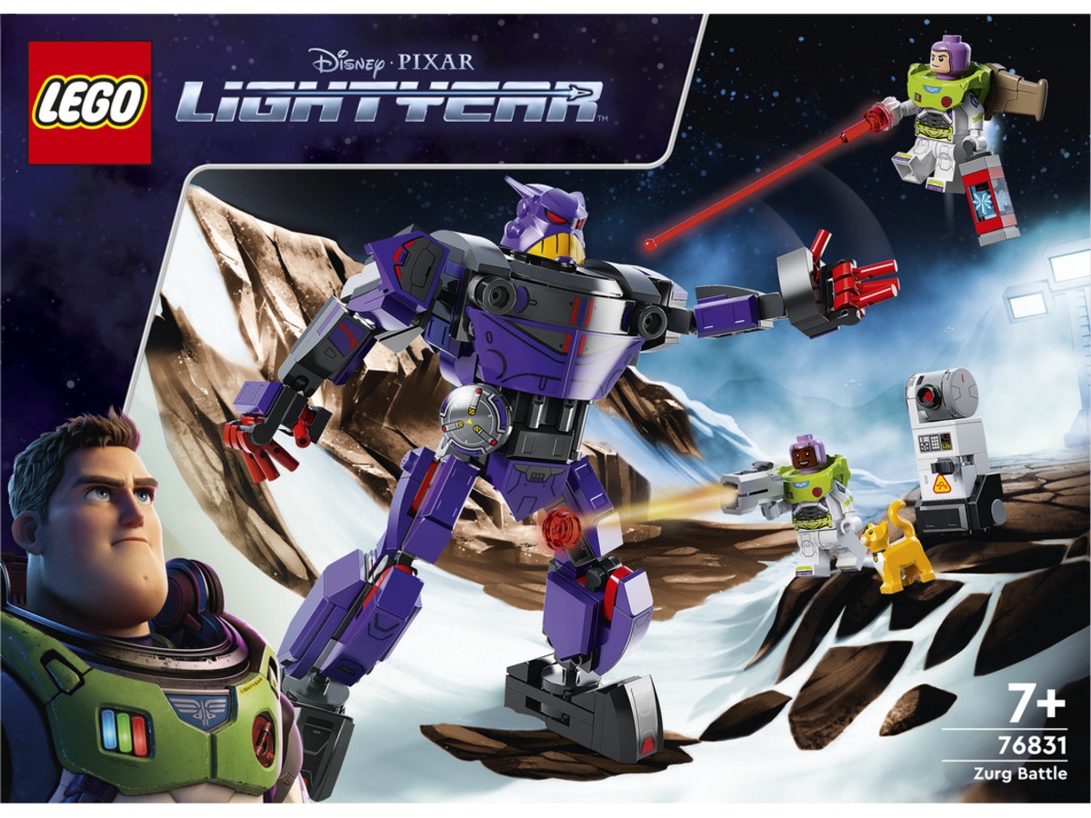 - Karakterer fra filmen – Zurg-kamp (76831) indeholder 2 minifigurer, bl.a. Disneys Buzz Lightyear, en LEGO® figur af en robotkat, en robot, der kan bygges, og en bevægelig mech-robot