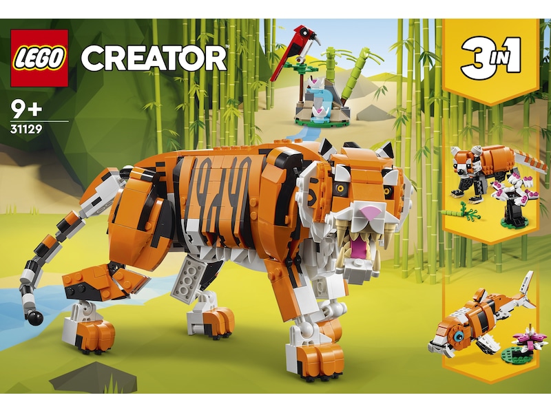 - 3 dyremodeller i 1 sæt – LEGO® fans kan nyde endeløse eventyr med byggesættet Majestætisk tiger (31129), der omfatter modeller af en tiger, en rød panda og en koi-fisk