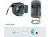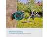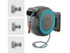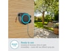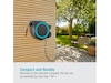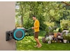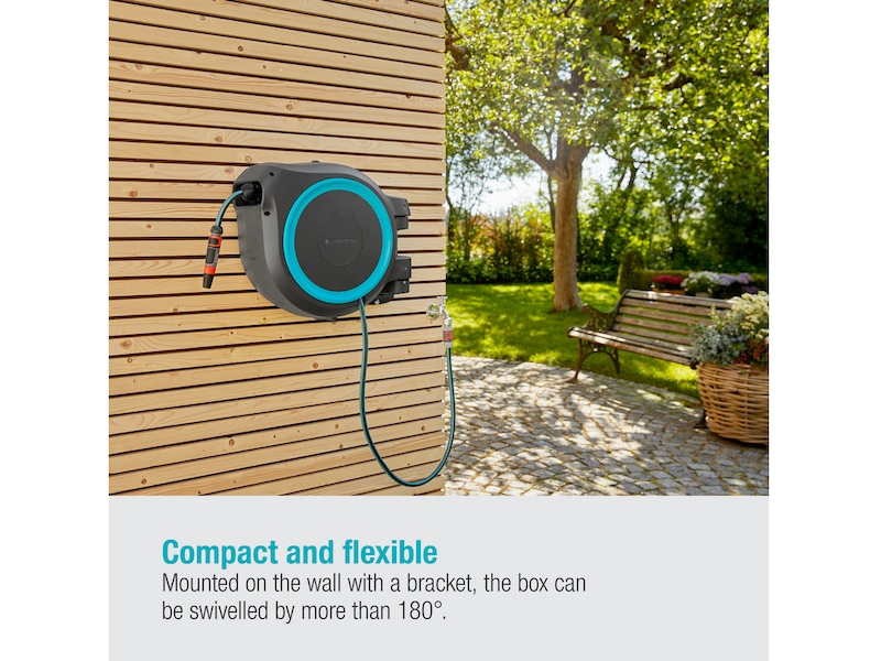 Takket være det praktiske vægbeslag kan slangeboksen svinges i en vinkel på 180°. Dette giver dig mulighed for at vande hvert hjørne af din have fleksibelt og uden at bøje slangen. Efter brug kan den kompakte boks skubbes til siden på væggen for at spare plads.
