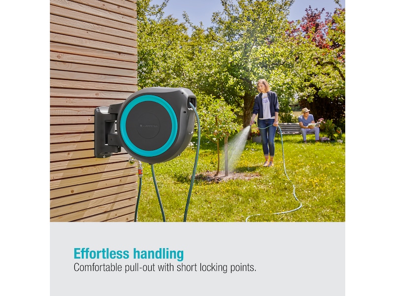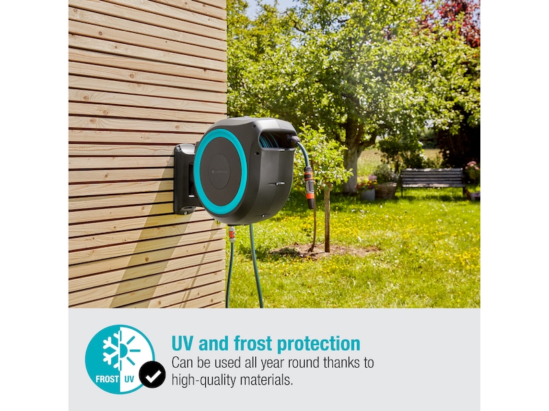 Stålfjederen af høj kvalitet inde i kassen ruller slangen op automatisk, pålideligt og jævnt. Innovativ RollControl-teknologi giver sikker og kontrolleret tilbagetrækning.