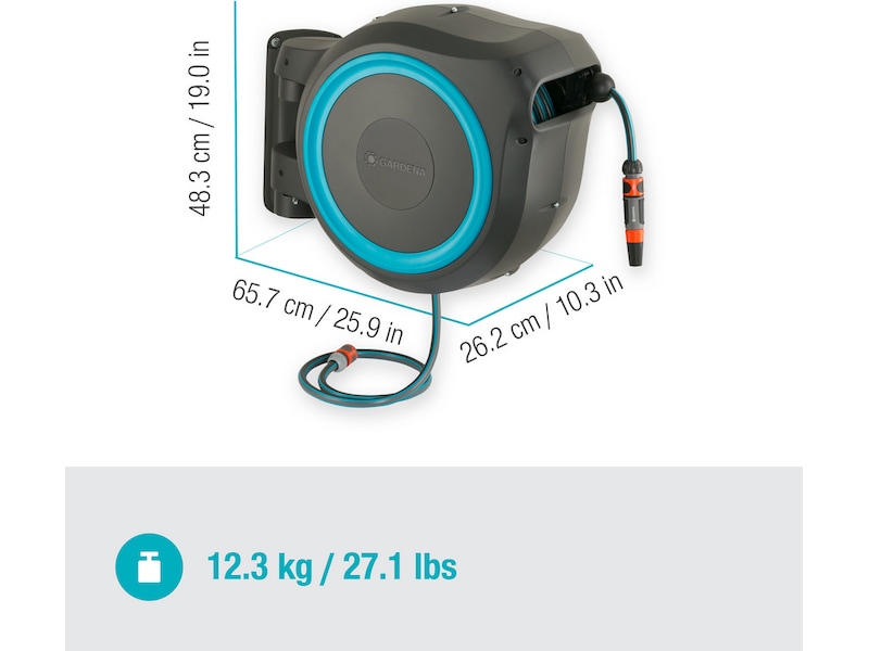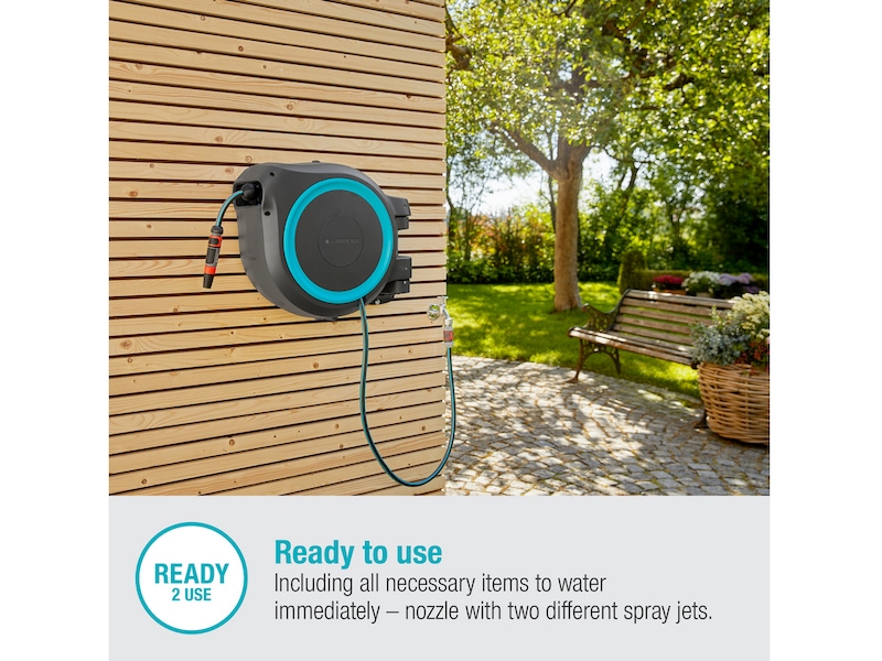 Den vægmonterede RollUp L slangeboks kommer med et vægbeslag, en 30 meter vandslange, en tilslutningsslange, alle nødvendige GARDENA systemdele og en dyse med to forskellige sprøjtedyser.