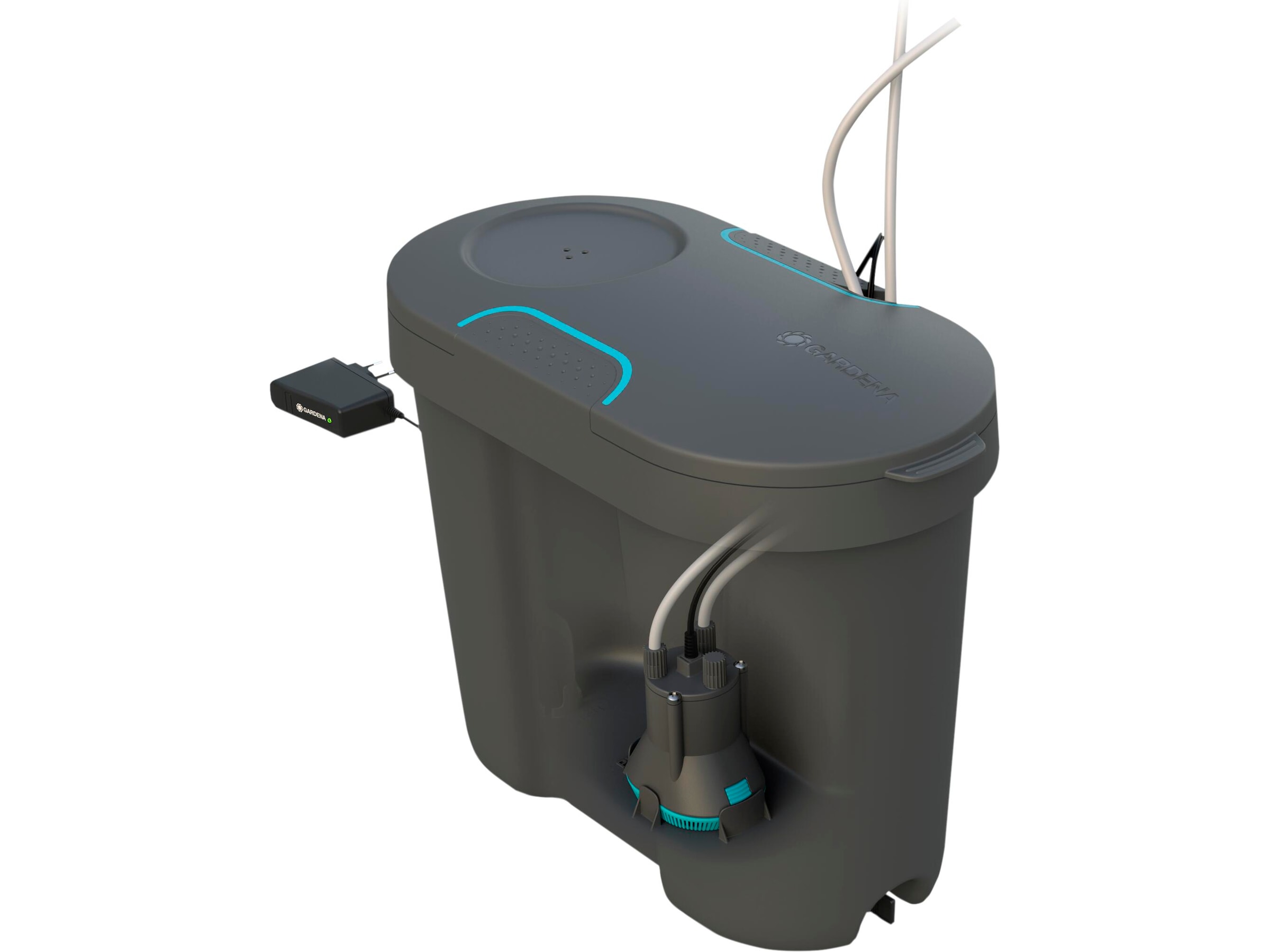 Den tilhørende vandtank er lavet af op til 80 % genbrugsmateriale. Fastgørelsesfunktionen i vandtanken sikrer optimal udnyttelse af vandet. Tanken kan bruges til opbevaring, og flere vandtanke kan tilsluttes, hvis der er behov for en større mængde vand.
