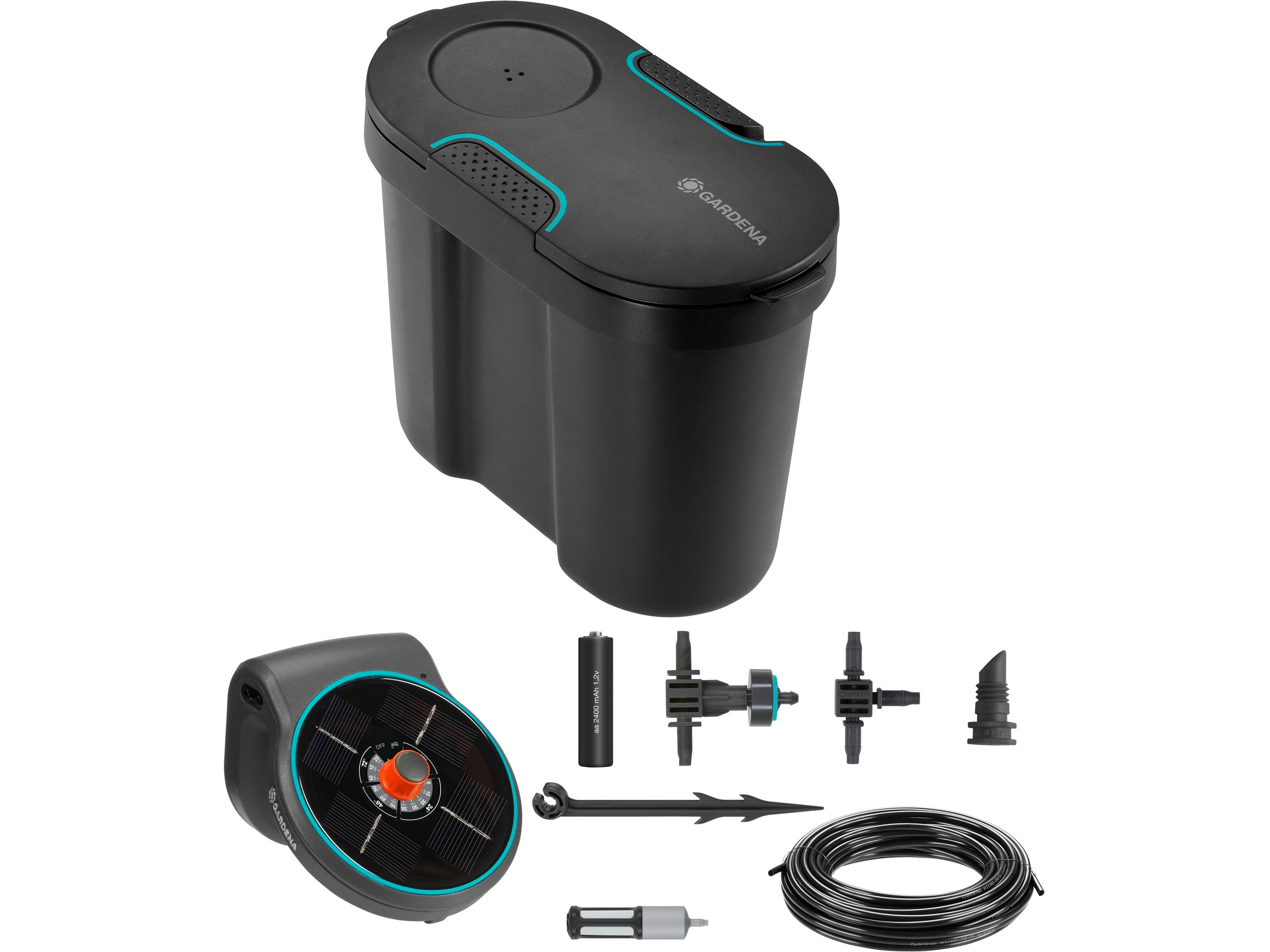 3-i-1 hovedenheden kombinerer en pumpe til at trække vand, en kontrolenhed, der definerer vandingsplanen, og et solpanel, der forsyner de medfølgende genopladelige batterier.
