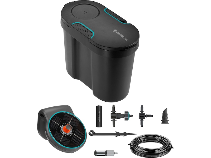 Det solcelledrevne vandingssæt med vandtank kræver ikke strømtilslutning. Kombinationen af et solpanel og genopladelige batterier garanterer pålidelig vanding hele sæsonen.