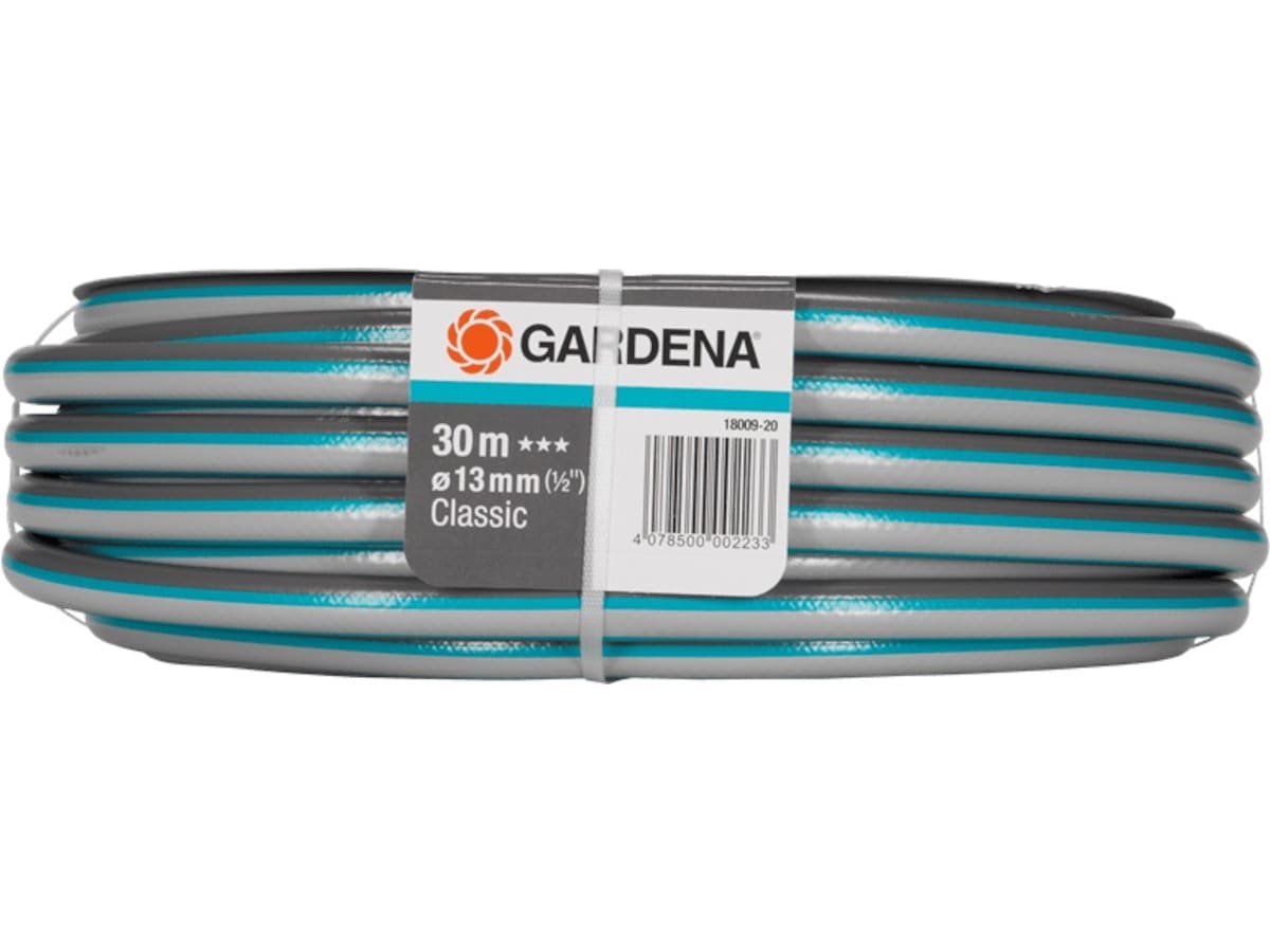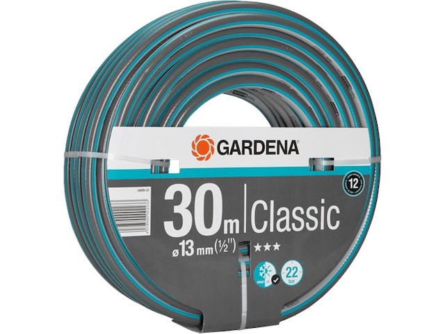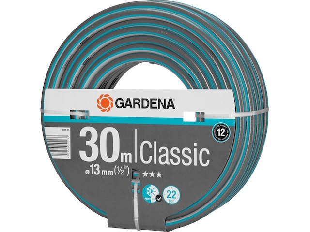 Den tykbestandige GARDENA Classic-slange, som bevarer sin form takket være brugen af tekstil ihøj kvalitet. Den er fri for skadelig plast (phthalater mindre end 0,1%), fri for cadmium, bly og barium (mindre end 0,1%) og selvfølgelig UV-bestandig. Om nødvendigt kan den suppleres systematisk med originale GARDENA systemforbindelser og udstyr. Udstyret er præcis, hvad du skal bruge til nem og fleksibel brug i haven. Brudstyrke: 22 bar. Garanti: 12 år.