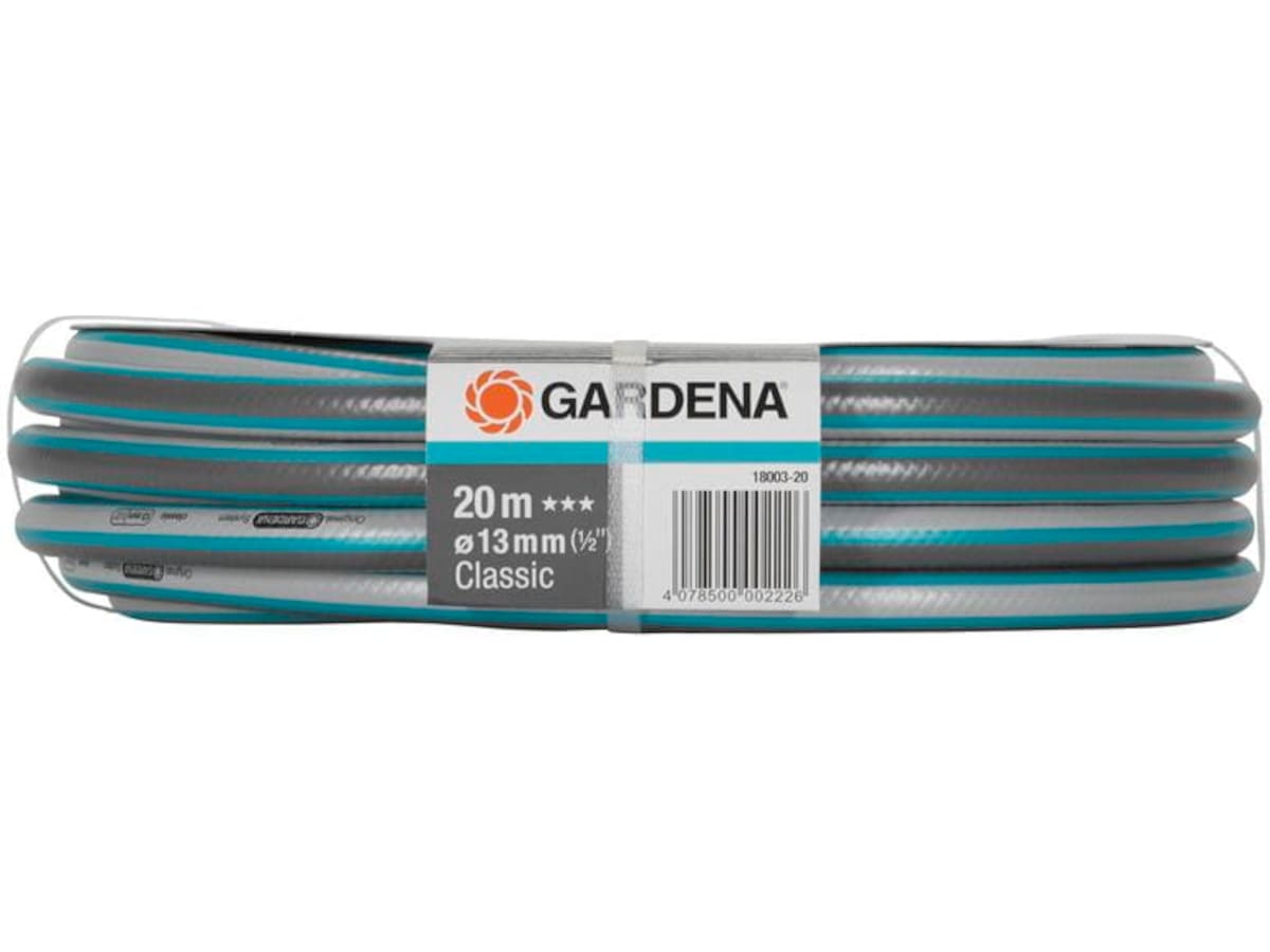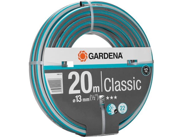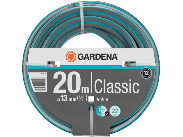 Den trykbestandige GARDENA Classic-slange, som bevarer sin form takket være brugen af tekstil i høj kvalitet. Den er fri for skadelig plast (phthalater mindre end 0,1%), fri for cadmium, bly og barium (mindre end 0,1%), og selvfølgelig UV-bestandig. Om nødvendigt kan den systematisk suppleres med originale GARDENA systemkoblinger og udstyr. . Udstyret er præcis, hvad du skal bruge til nem og fleksibel brug i haven. Brudstyrke: 22 bar. Garanti: 12 år.