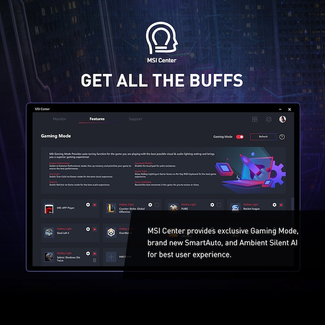 Det eksklusive MSI Center hjælper dig med at kontrollere og tilpasse din MSI-bærbare computer, som du vil. Overvåg, juster, optimer mange nyttige funktioner, der er indbygget i et samlet system. Det giver maksimal fleksibilitet med nye funktioner som Smart Image Finder, UI Skin option og mere til at tilpasse dine personlige præferencer.