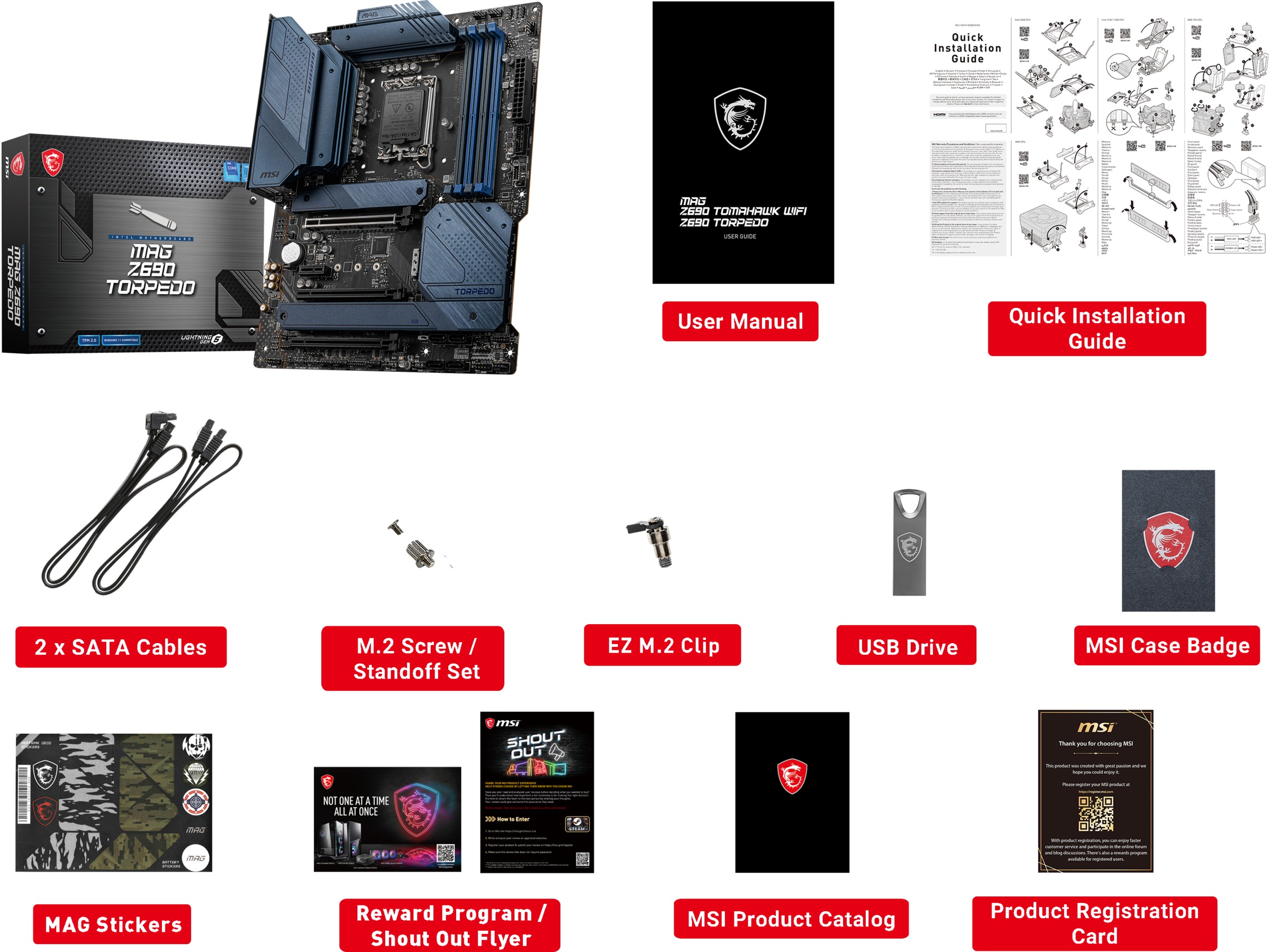 | Inkluderet tilbehør | 1 x M.2 skrue, 1 x M.2 klemme, Etuiskilt, USB-drev, Standoff til M.2 sokkel, MAG-mærkater |