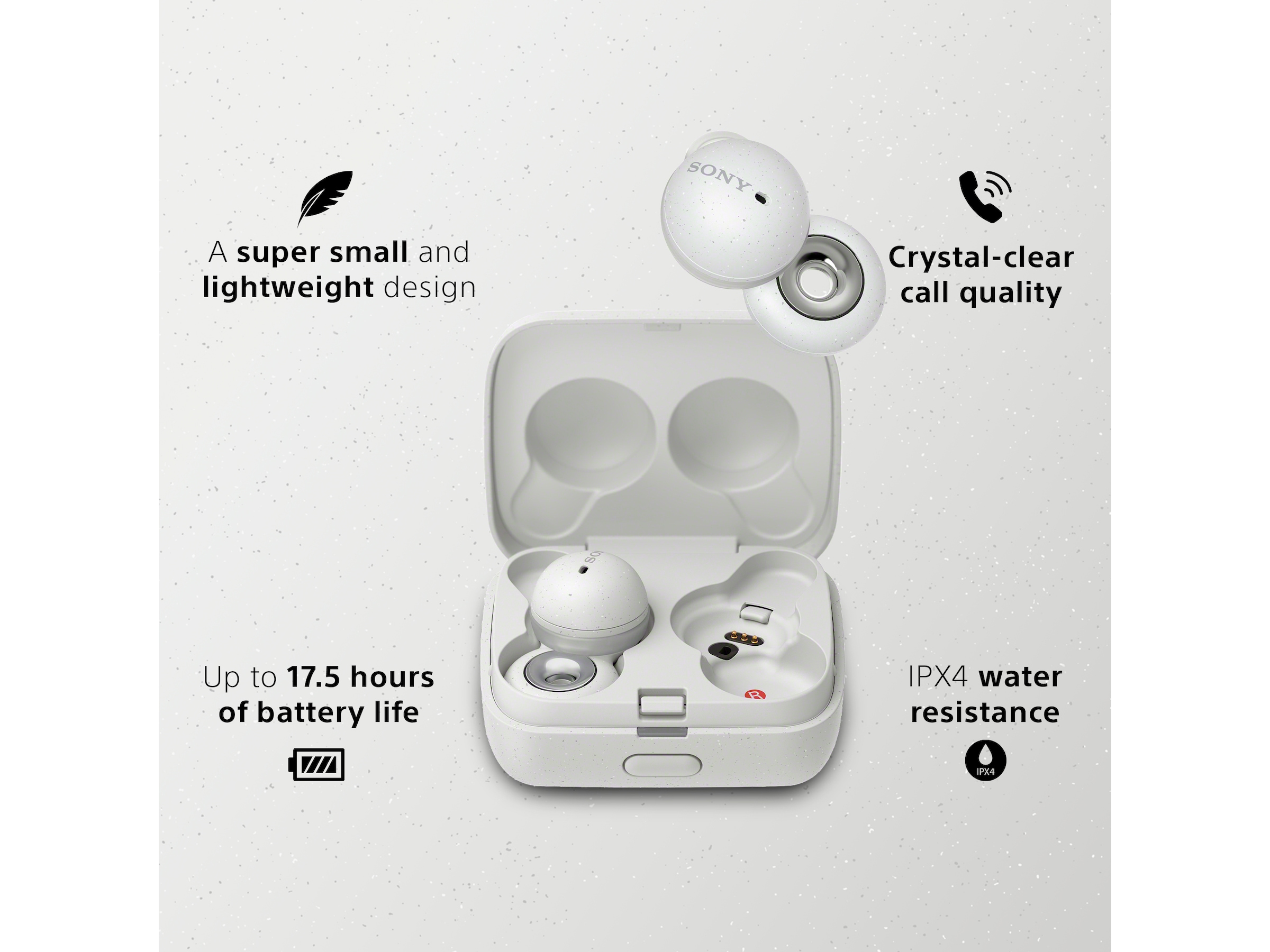 LinkBuds kommer med et utal af ’smart listening’ funktioner så som Adaptive Sound Control og Wide Tap Area. Det giver bedre playback kontrol og gør LinkBuds super nemme at bruge. De er ligeledes vandafvisende på IPX4 niveau, har op til 17,5 timers batteritid og hurtig opladning, så du aldrig behøver at slukke for dine høretelefoner.