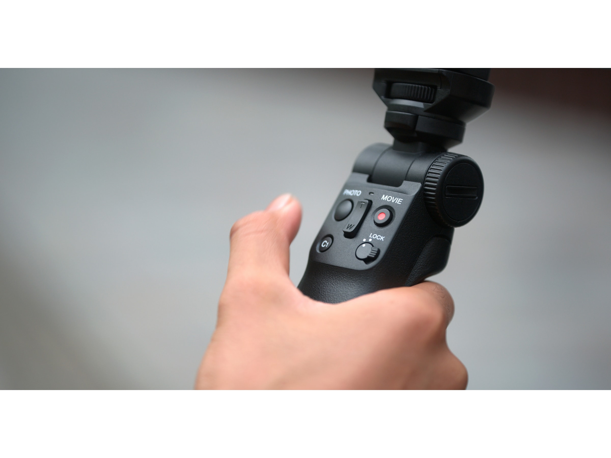 Med en kompatibel smartphone monteret kan fjernbetjeningskontroller for stillbilleder og filmoptagelse betjenes ved at holde normalt på grebet uden at røre ved smartphonen.