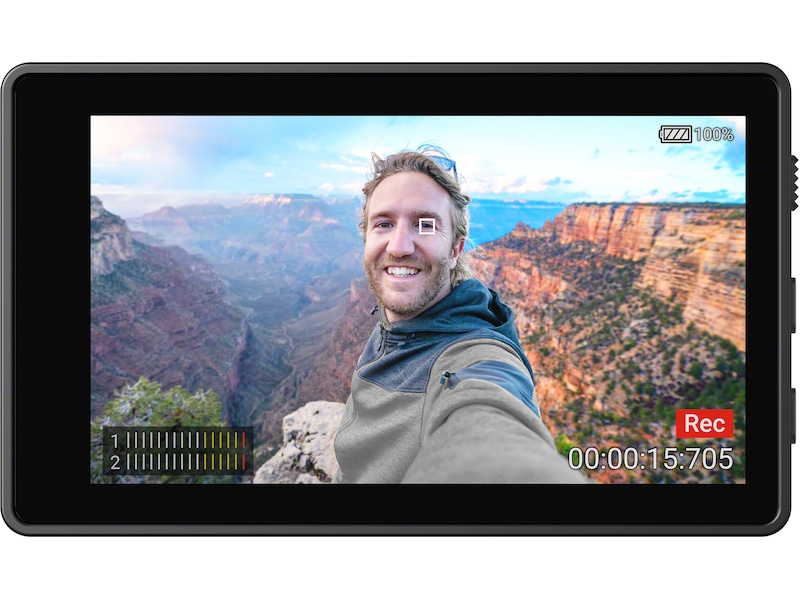 Vlog-skærmen er udstyret med et 3,5 mm mikrofonstik med 3 poler, der gør det muligt at tilslutte din egen eksterne mikrofon4 og optage endnu bedre lyd. Du skal bare sætte mikrofonen i tilbehørsskoen øverst i holderen. Den er også udstyret med 1/4-20 UNC-type monteringspunkter, én i bunden af holderen, og én på bagsiden af skærmen, så du kan tilslutte andet tilbehør, f.eks. stativer, greb eller selfiestænger.