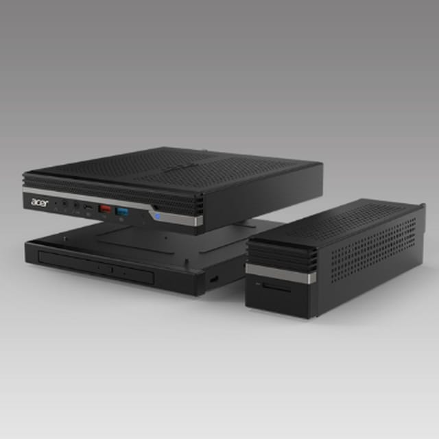 Med det yderst kompakte format, der kun fylder 1 liter, kan den stationære Veriton N-computer placeres hvor som helst, enten liggende eller stående takket være foden. Du kan oven i købet nemt tænde computeren via skærmens tænd/sluk-knap.