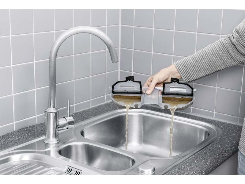 2-tank-system: Rullerne fugtes permanent fra ferskvandsbeholderen samtidig med, at snavset ledes til beholderen med snavset vand. Uden indsats: Du behøver ikke at gå rundt med en spand, vride en klud ud i hånden eller skrubbe gulvet. Rullerne kan maskinvaskes op til 60°C.