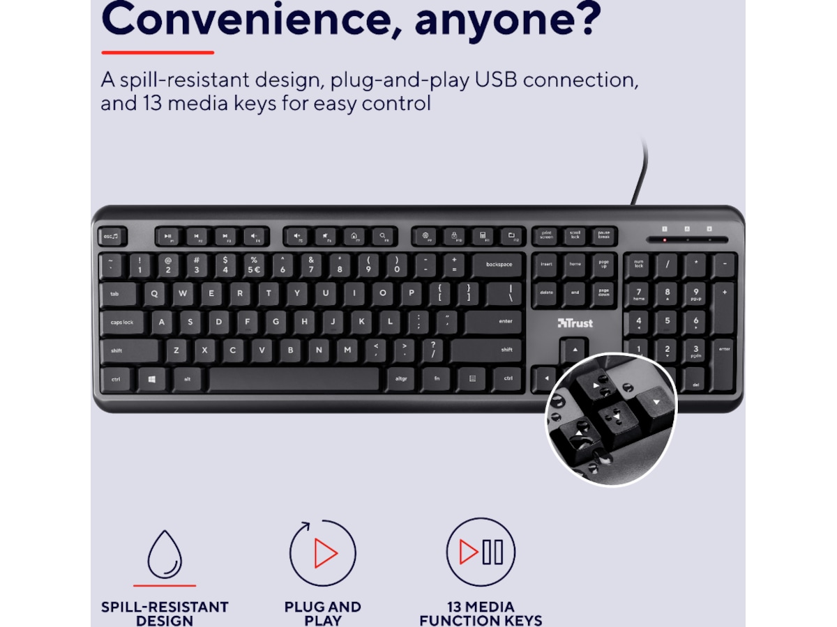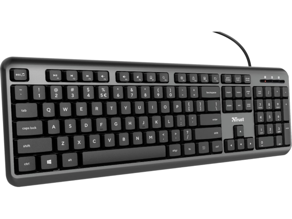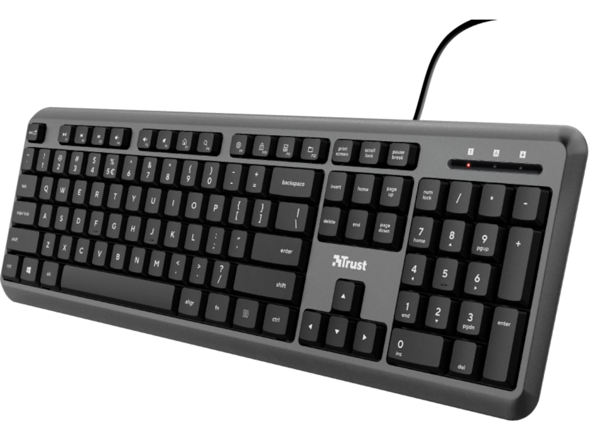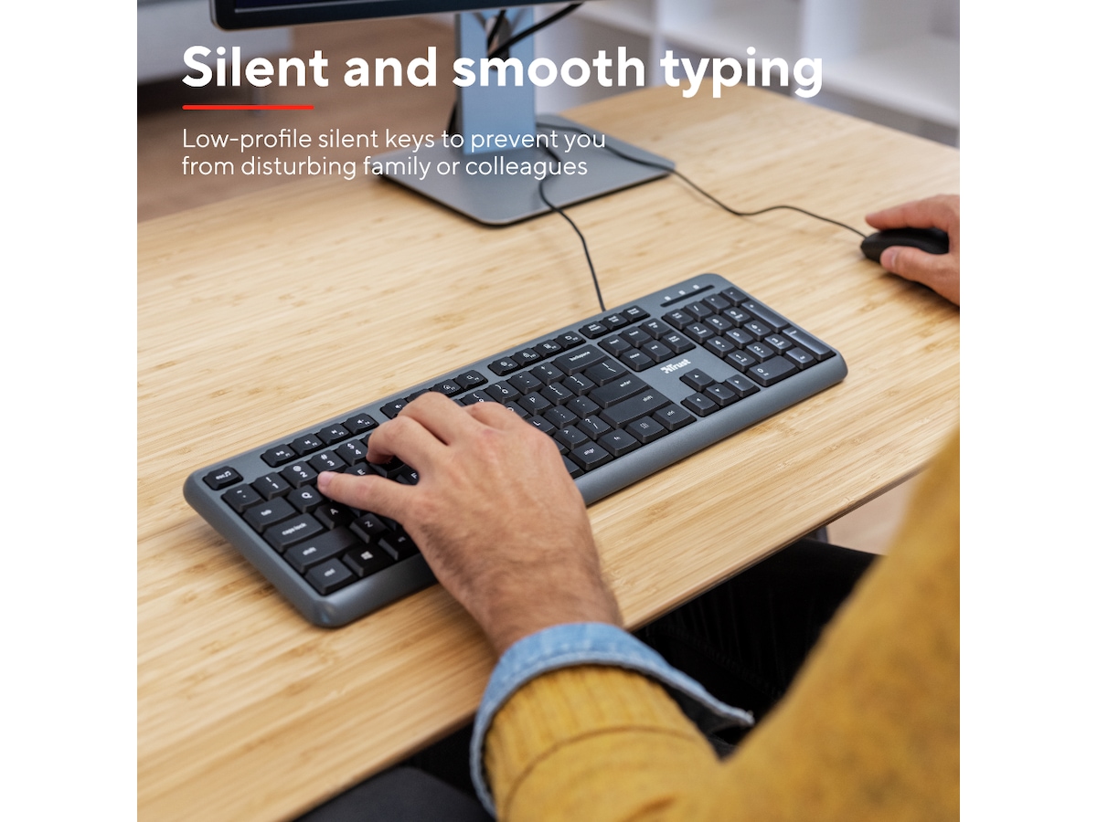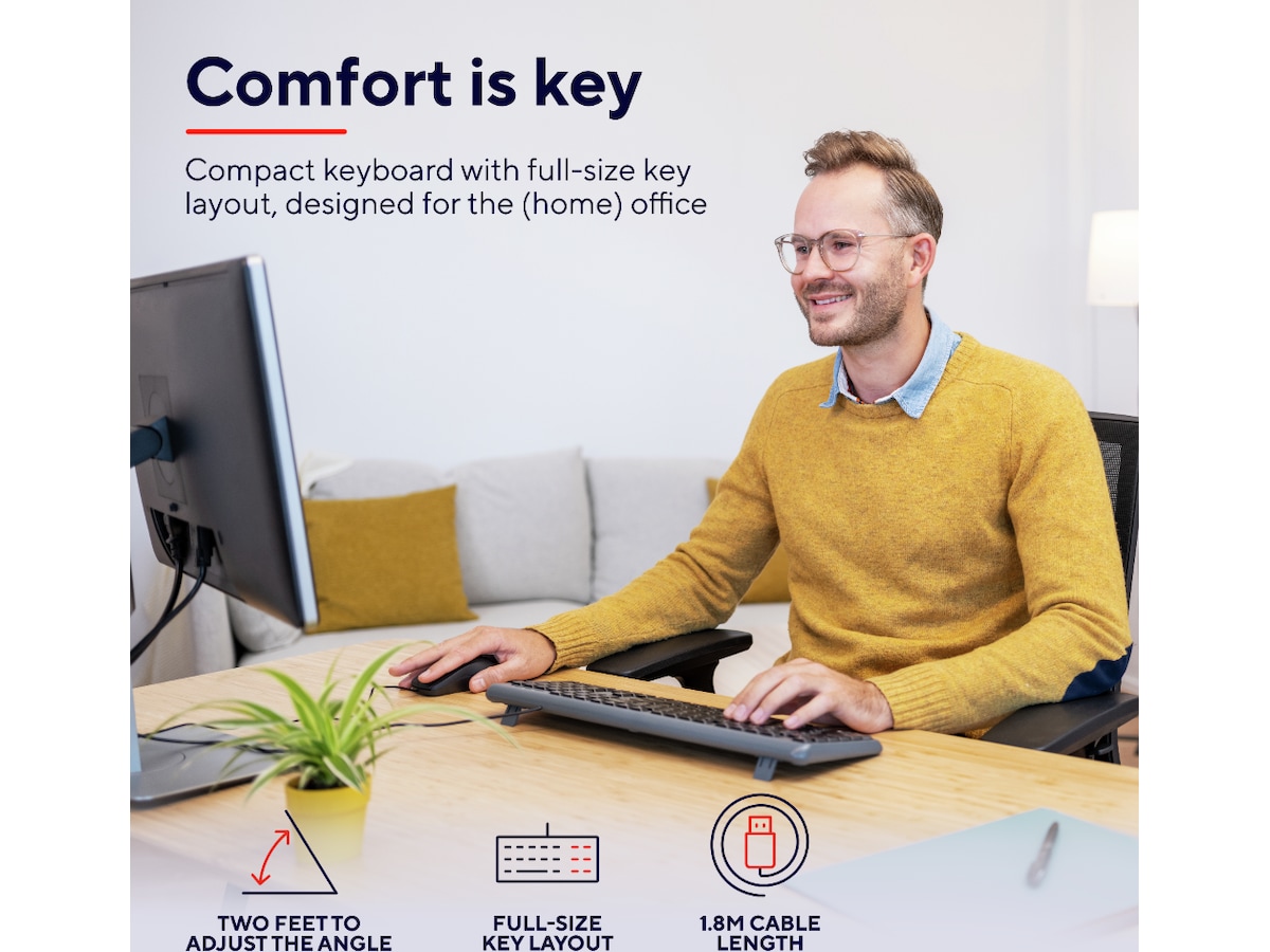 Dit kontor, dit valg. To udfoldelige fødder giver dig mulighed for at justere tastaturets højde, mens et 1,8 m kabel giver dig bevægelsesfrihed til at placere det hvor som helst på dit skrivebord.