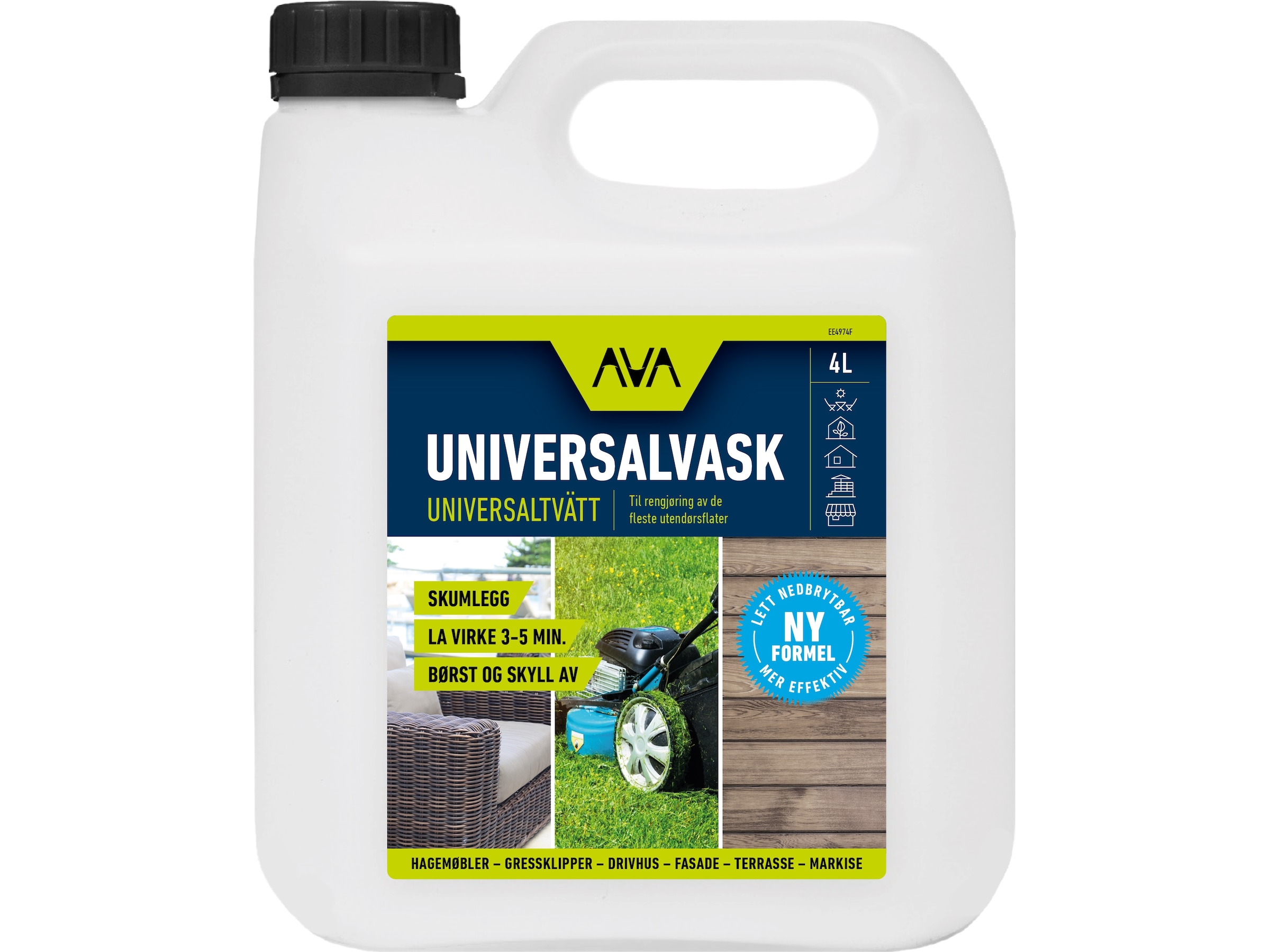 AVA universalvask er et meget fleksibelt, sæbebaseret rengøringsmiddel, som du kan bruge på forskellige overflader og genstande rundt omkring i huset – herunder havemøbler, markiser, presenninger, haveredskaber, garageporte, rækværk, facader og terrasser.