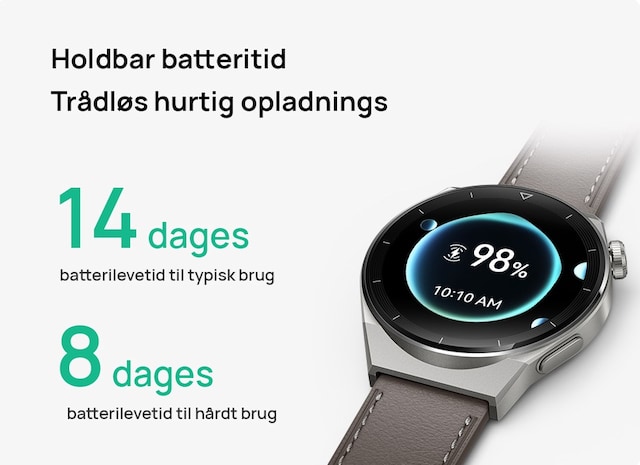 Lang batterilevetid og hurtige opladningsfunktioner gør daglig brug ubesværet. Batteriet holder op til 14 dage ved normal brug og med en hurtig opladning kan du oplade 25 % af batteriet på kun 10 minutter.