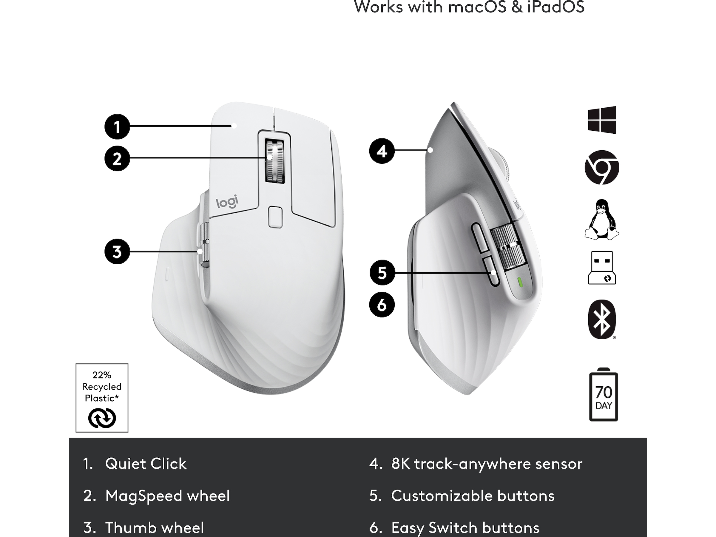 Egenskaber Genopladeligt batteri, Quiet Clicks-teknologi, Gestikulationsfunktion, Brugerdefinerbar DPI, Tommelhjul, Tommelstøtte, Logitech Darkfield Laser Tracking, MagSpeed-hjul, Easy-Switch teknologi