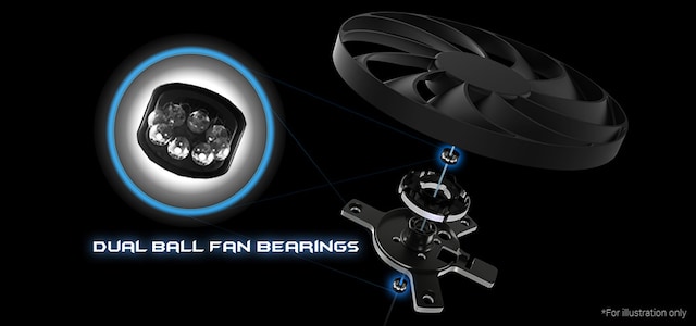 - Axial-tech kølingsdesign Med et mindre nav, der muliggør længere blade og en dækring, der forøger det nedad rettede lufttryk.