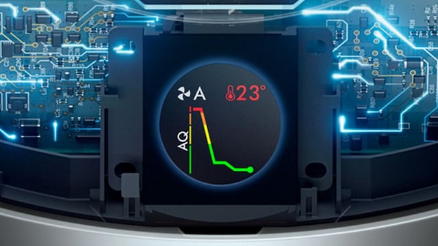 Detekterer og registrerer automatisk forurenende stoffer. Renser luften og opvarmer hele rummet.