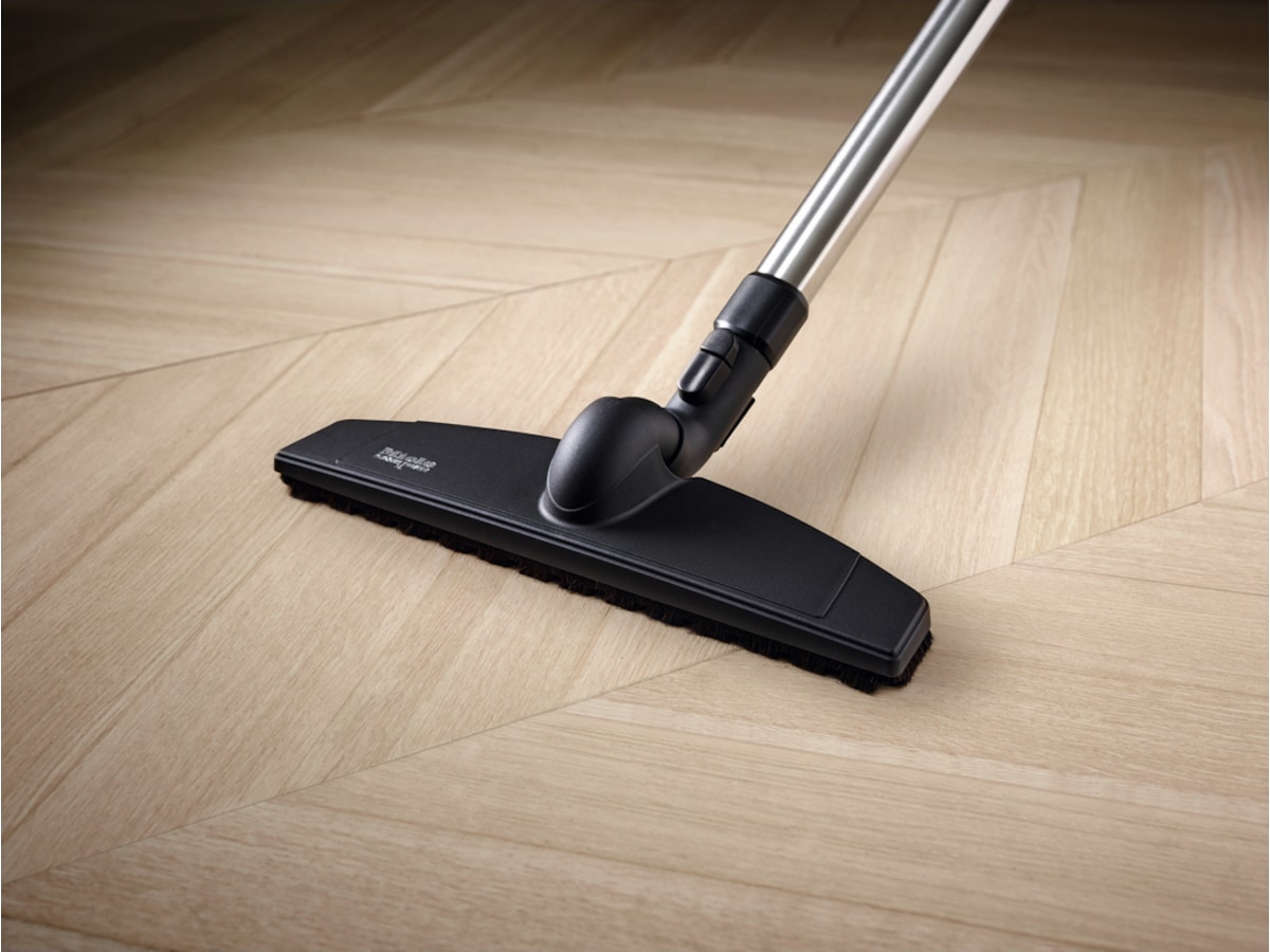 Gulvmundstykket kan let sættes fast på bagsiden af støvsugeren, så sugerøret står sikkert og tilgængeligt i arbejdsstilling. Enormt smart: på udvalgte Complete C3-modeller slukkes motoren automatisk, så du ikke behøver at bøje dig ned.