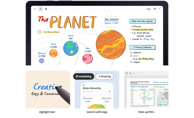 S Pen er flere tegne- og skriveværktøjer i ét. Det naturlige greb og den imponerende trykfølsomhed gør den særdeles velegnet til alt fra tegning til dokumentredigering. Og takket være den magnetiske holder behøver du ikke at være bekymret for at tabe din S Pen.