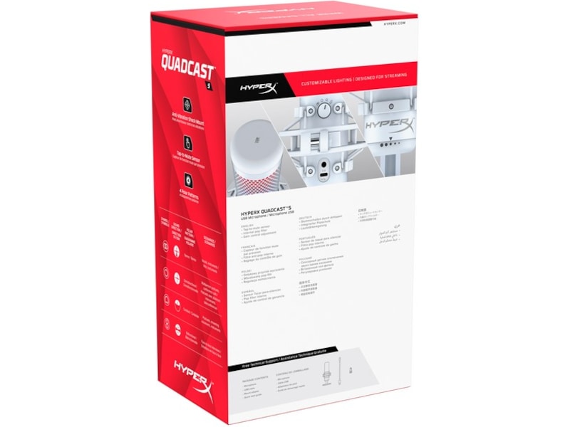HyperX QuadCast™ S er en USB-kondensatormikrofon, som båder lyder godt og ser godt ud. Det vildt imponerende RGB-lys og de dynamiske effekter giver enhver stream eller opsætning stil og personligt præg, som kan tilpasses via HyperX NGENUITY-softwaren. QuadCast er en komplet mikrofon med antivibrationsdæmper, som hjælper med at reducere rumlelyde i baggrunden, og et indbygget popfilter, som dæmper slaglyde. Se straks din mikrofonstatus på LED-indikatoren, og slå nemt mikrofonen fra på knappen for at undgå utilsigtede udsendelser og optagelser. Mikrofonen har fire valgbare polmønstre og er forberedt på næsten enhver optagesituation og er desuden udstyret med en forstærkningsknap til justering af indgangsfølsomheden. Den medfølgende monteringsadapter passer til både 3/8"- og 5/8"-gevind og er kompatibel med de fleste stativer.
