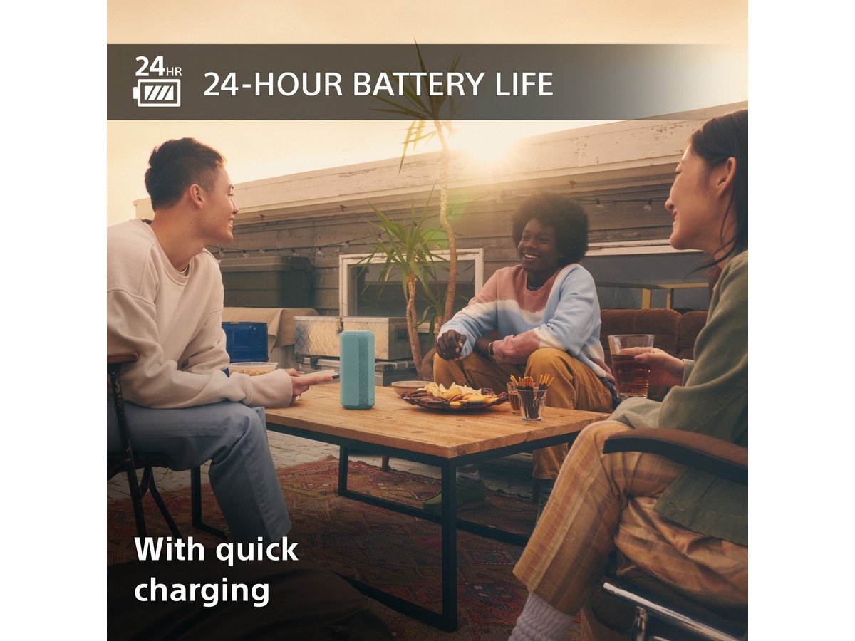 Takket være Sonys unikke Line-Shape Diffuser teknologi bliver lyden jævnt fordelt, og når endnu bredere og længere, så du og dine venner kan nyde den samme fantastiske lydoplevelse uanset hvor højttaleren er placeret.