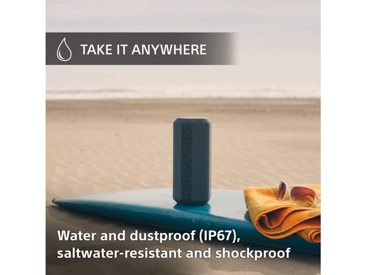 Tag din bærbare højttaler med dig overalt, uanset hvor du går uden bekymringer; SRS-XE300 er vand- og støvafvisende (IP67), saltvandsbestandig og stødsikker.