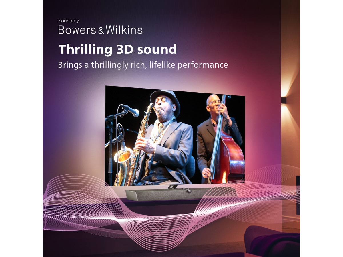 Et TV, som enhver sofa ville være stolt af at pege mod. Bliv fortryllet af blæksorte nuancer, fyldige OLED-farver og krystalklar lyd fra Bowers & Wilkins. Og Ambilight – som fylder rummet med spændingen ved alt, hvad du ser eller lytter til.