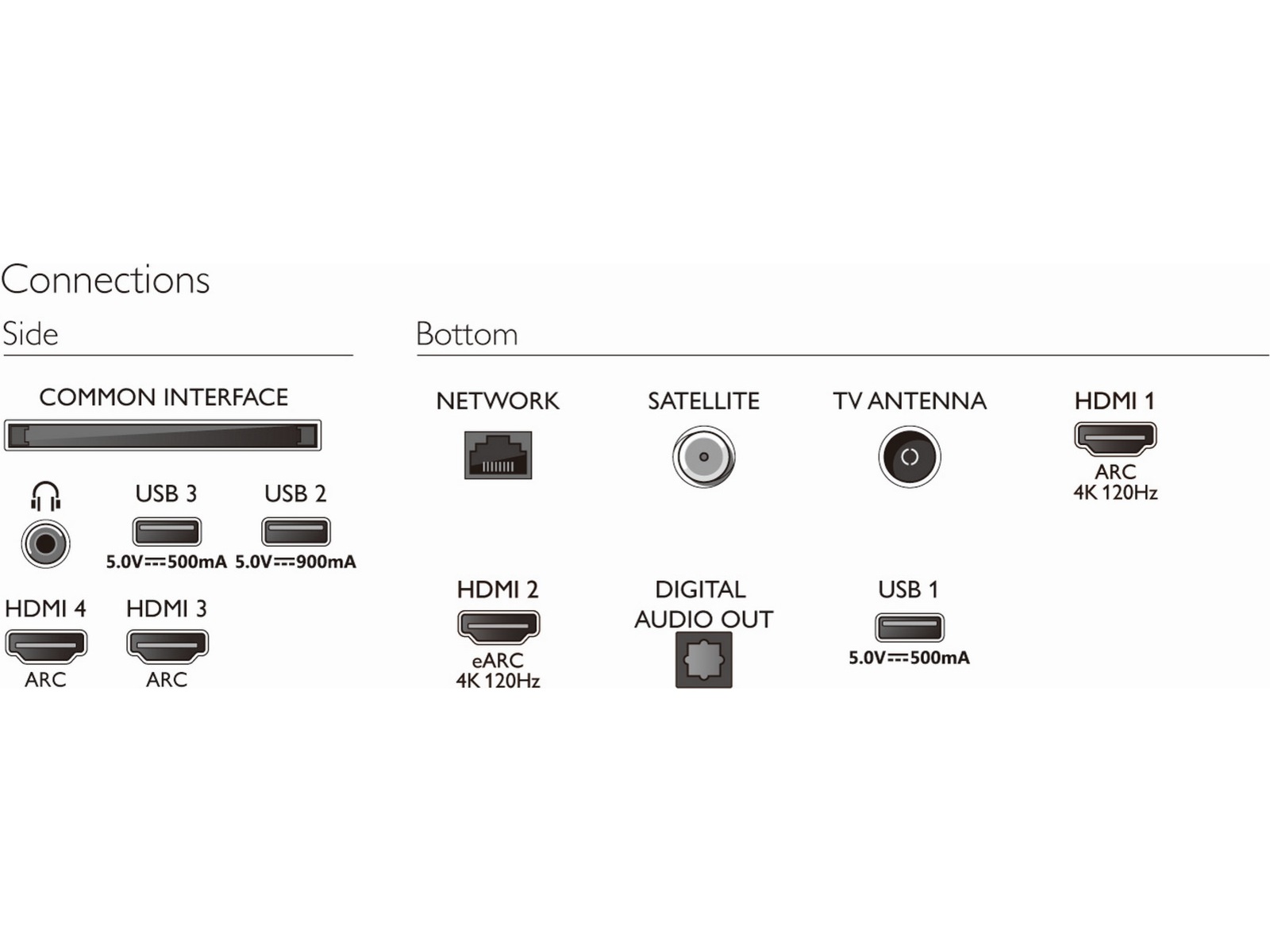 Forbindelsestype USB - nederst, 2 x HDMI - nederst, Digital lydudgang (optisk) - nederst, 2 x USB - side, LAN - nederst, Hovedtelefoner - side, 2 x HDMI - side