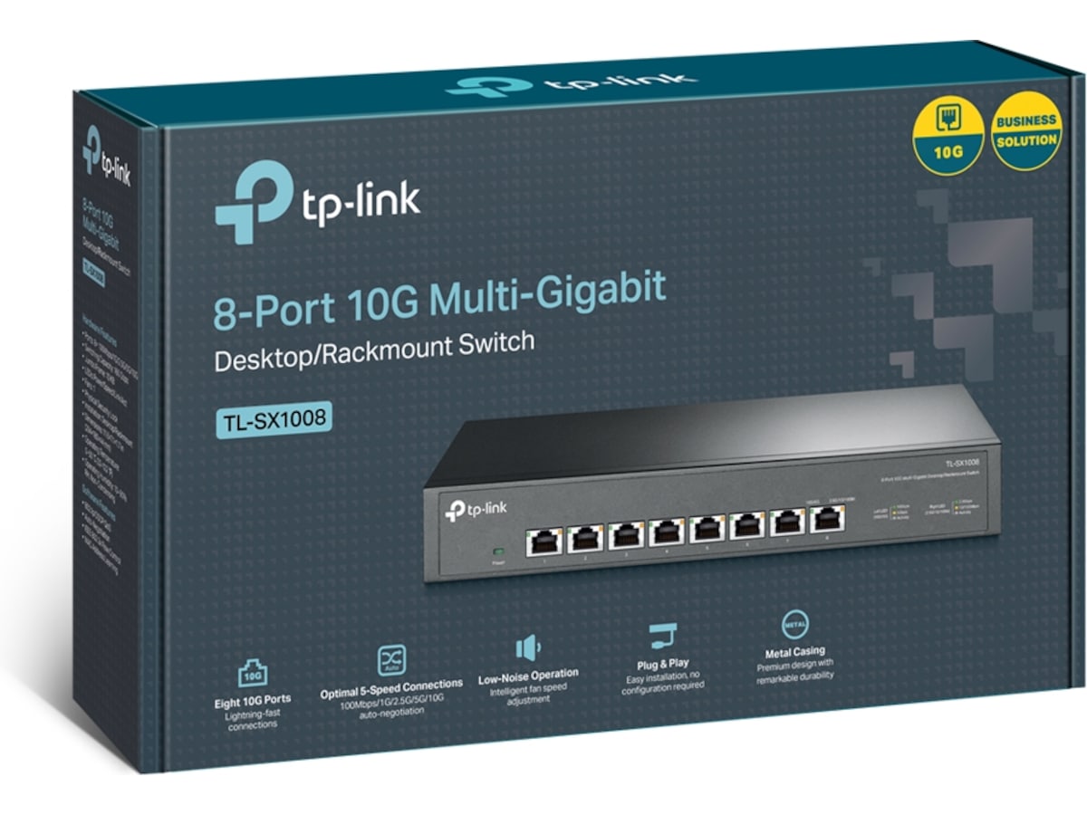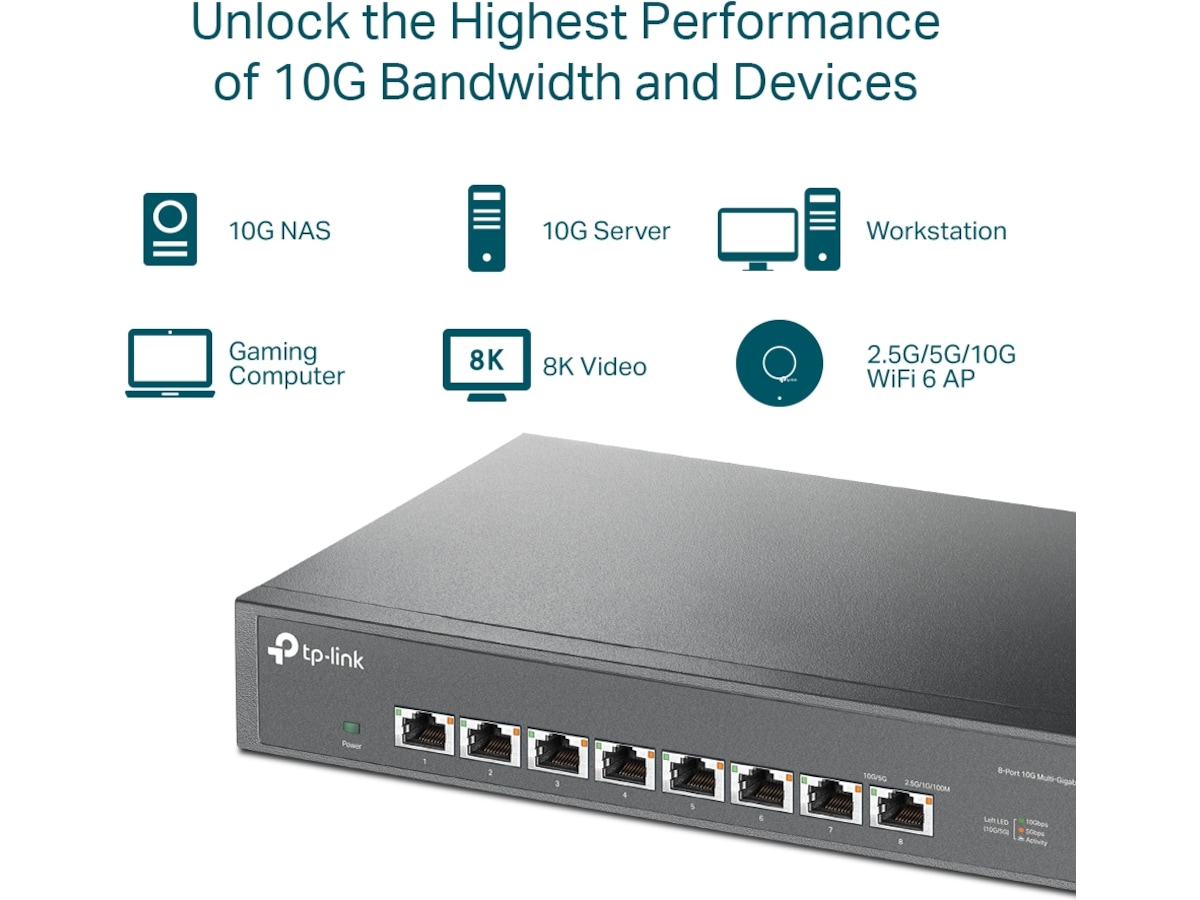 Som flagskibs-10G-produktet er TL-SX1008 en 8-ports 10G desktop/rackmonteret switch, der giver op til 160 Gbps switchkapacitet. Auto-negotiation 5 hastighedsforbindelser (100Mbps/1G/2.5G/5G/10G) registrerer linkhastighederne og justerer intelligent for kompatibilitet og optimal ydeevne for alle dine enheder, inklusive 10G NAS, 10G server, arbejdsstation, gaming computer, 2.5G /5G/10G WiFi 6 AP, 8K video, desktop og mere.