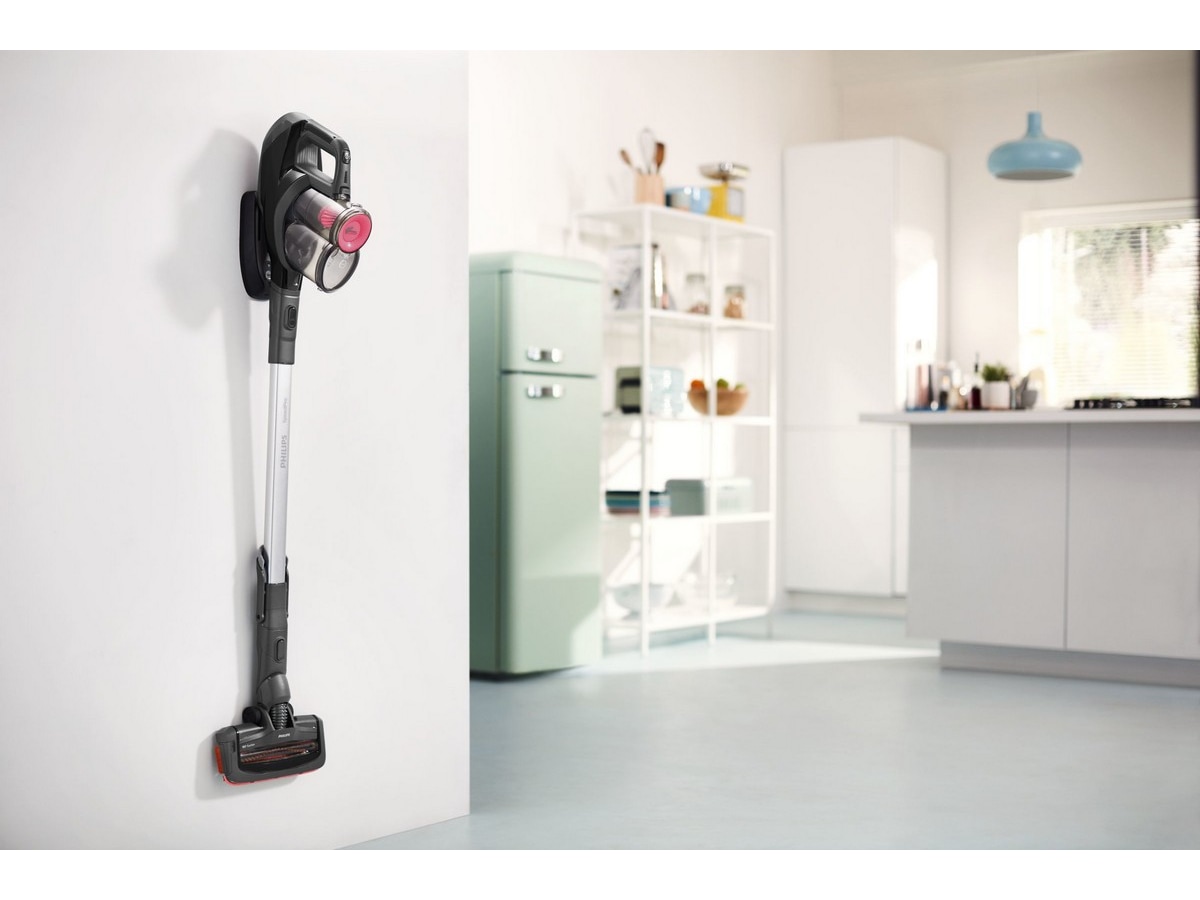 Den nye trådløse SpeedPro-støvsuger gør hurtigt rent og har en bred vifte. Den er udstyret med en 180° dyse, der præcist absorberer støv, selv i vanskelige områder, nær vægge, møbler og i hjørner.