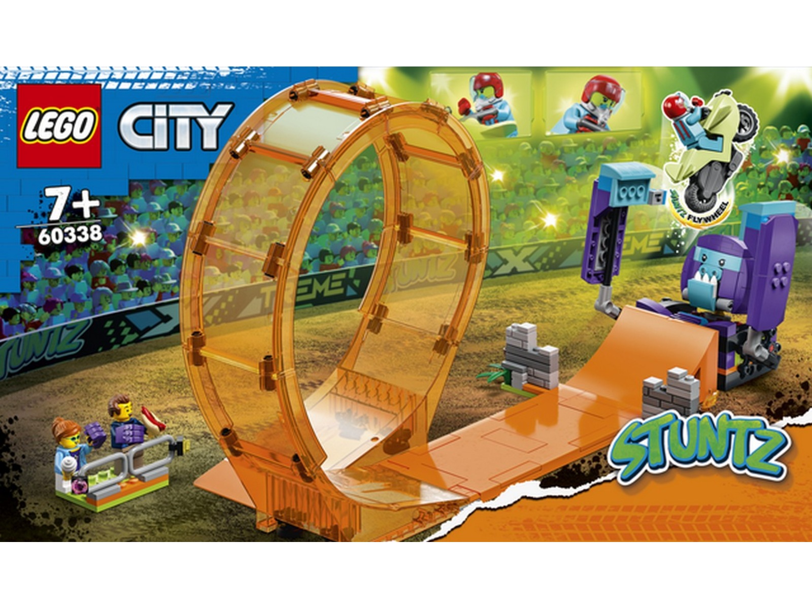 • Hvad er der i æsken? – Alt, hvad børn behøver for at bygge en stuntbane med en smadrende chimpanse, loop og rampe, samt en svinghjulsdrevet stuntmotorcykel og 3 minifigurer