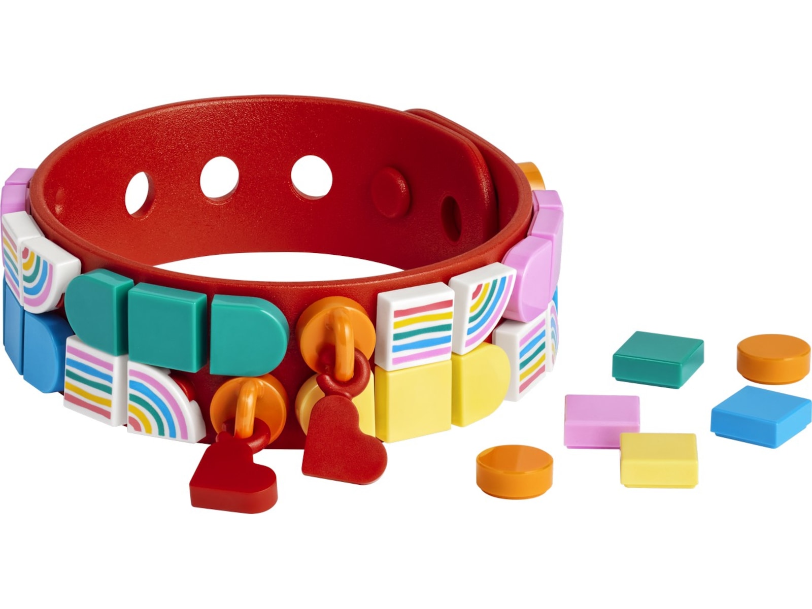 Tilføj de sjove mosaikker med regnbuemotiv, og sæt den flotte røde vedhængsholder og det røde hjertevedhæng på for at vise din stil. Frisk på lidt forandring? Redesign armbåndet, så det passer til dit humør, eller byt og del med familie eller venner! #youDOTyou