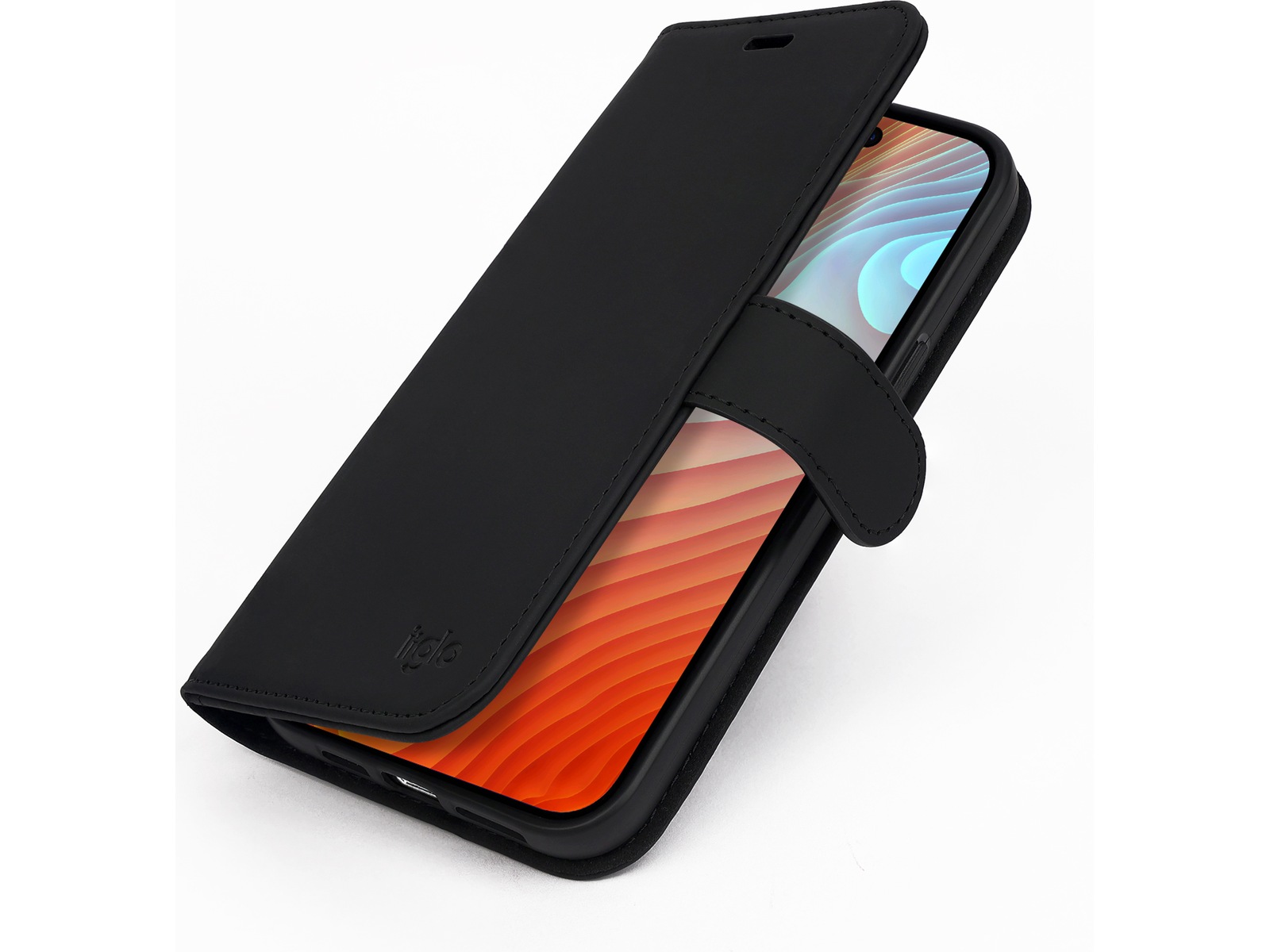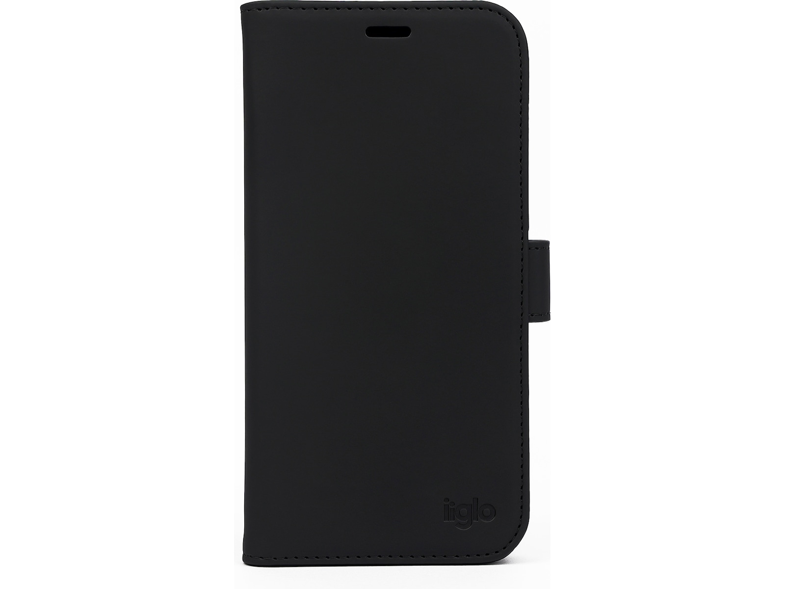 Beskyt din iPhone med iiglo iPhone-tegnebogsetui i sort design Dette etui er lavet af førsteklasses PU-læder, der er et blødt og slidstærkt materiale. Etuiet beskytter mod stød og ridser. Den magnetiske strop sikrer, at etuiet lukkes, selv når telefonen er i jakkelommen eller PC-tasken.