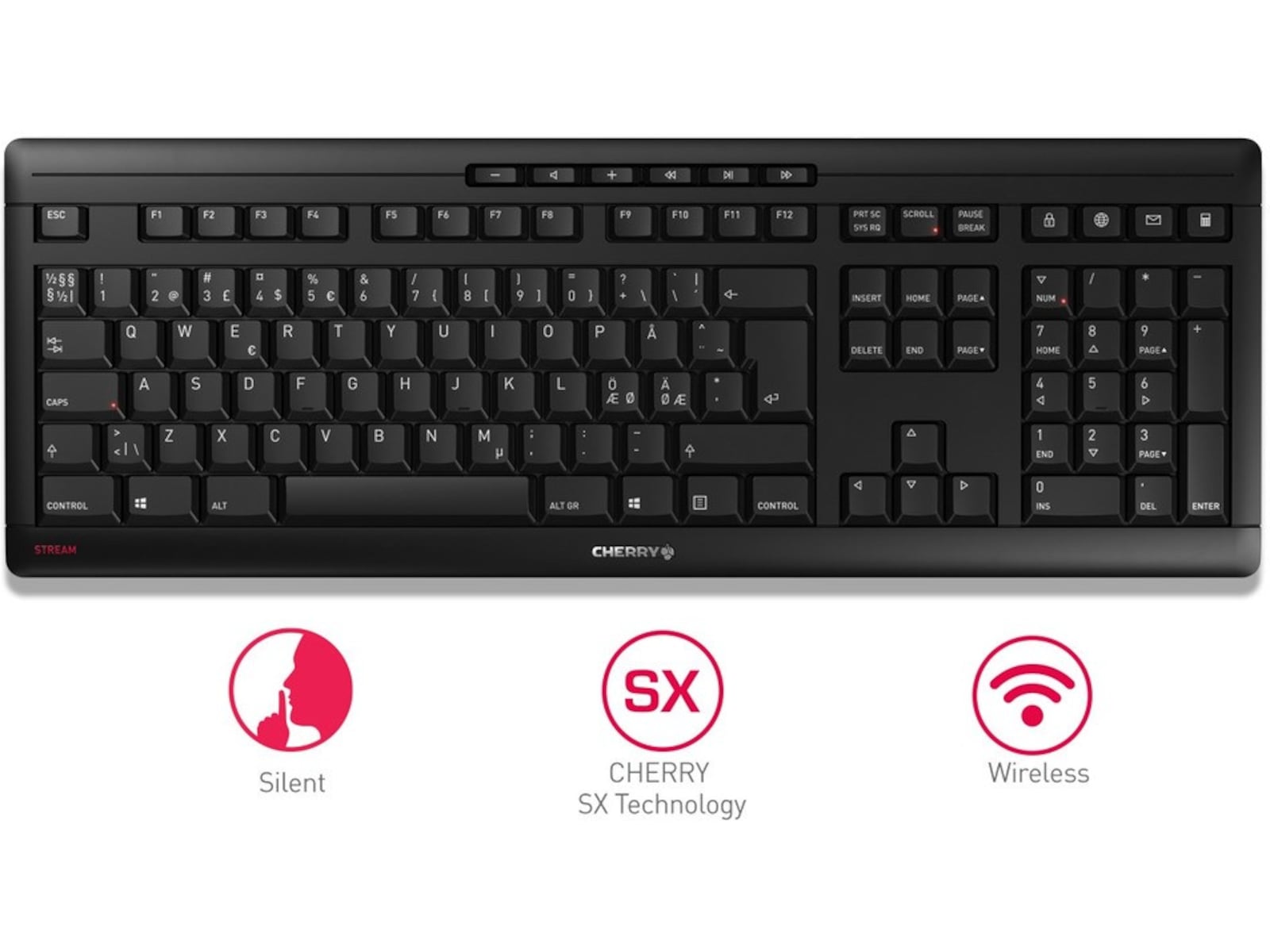 Leder du efter et vedligeholdelsesfrit og trådløst tastatur til hyppige maskinskrivere, og værdsætter du fordelene ved CHERRY SX-sakseteknologien? CHERRY STREAM KEYBOARD WIRELESS er det rigtige valg for dig. Det kombinerer alle fordelene ved det velkendte STREAM KEYBOARD med trådløs 2,4 GHz-teknologi, hvilket gør det til en rigtig allrounder i hverdagen.
